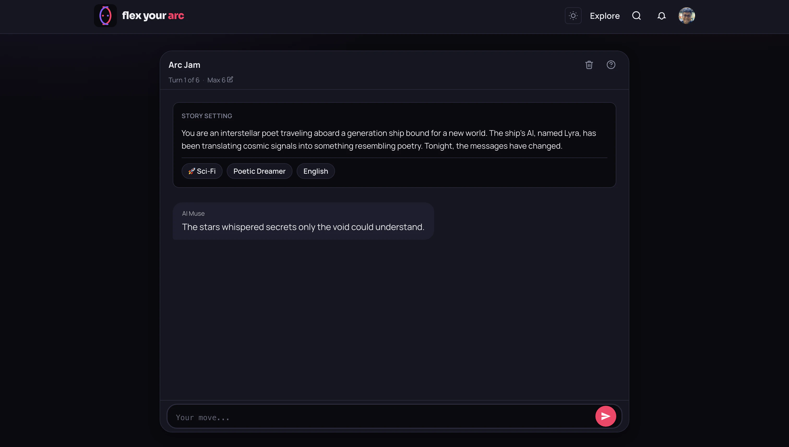 FlexYourArc is a fast social creativity game where you co-create stories with an AI Muse, one tur...