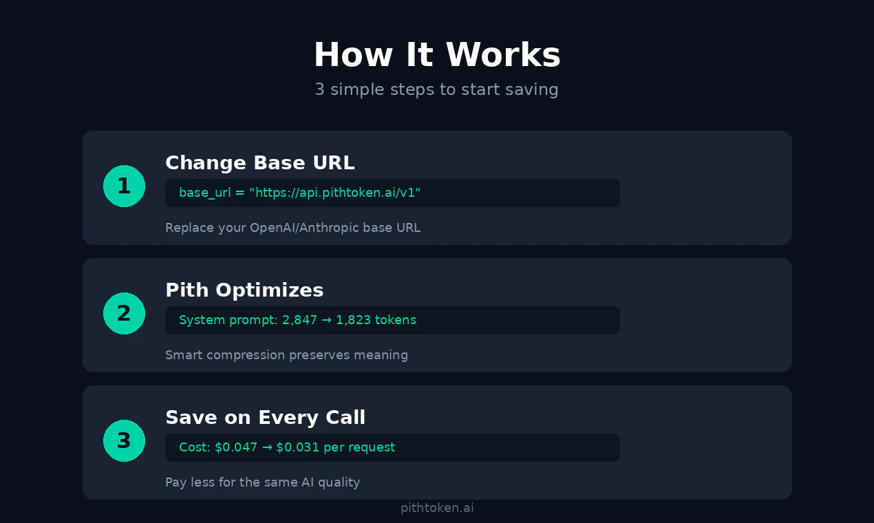 Meet Pith. It optimizes your prompts before they hit OpenAI or Anthropic — saving you up to 30% o...