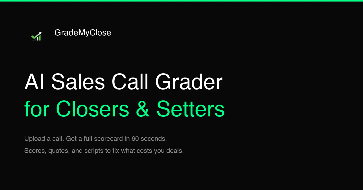 Upload any sales call recording or paste a transcript. In 60 seconds, GradeMyClose gives you a fu...
