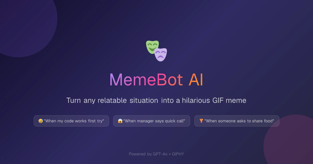 Type a situation. Get a hilarious GIF meme. Powered by AI.