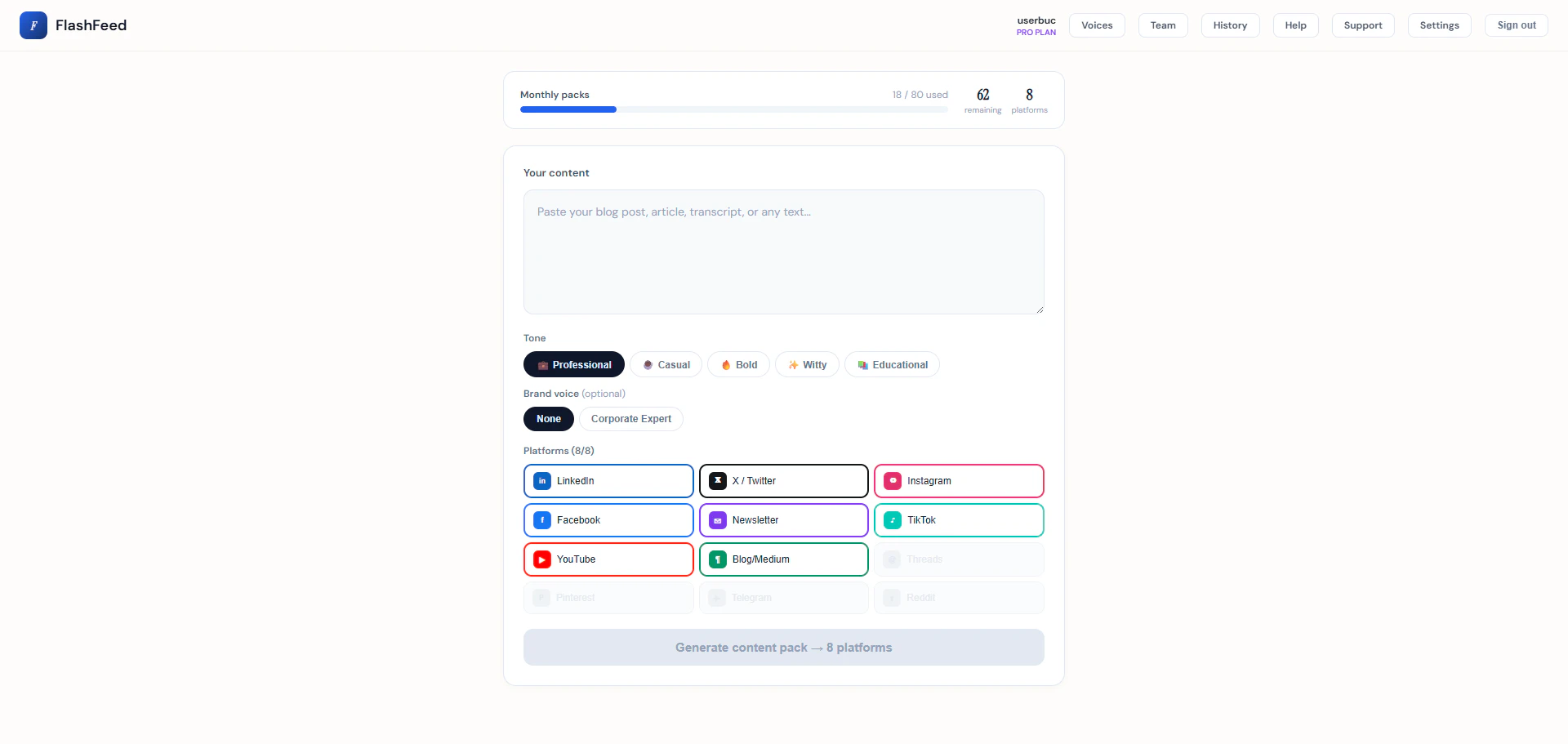 FlashFeed is an AI-powered content repurposing tool. Paste any blog post, article, or transcript ...