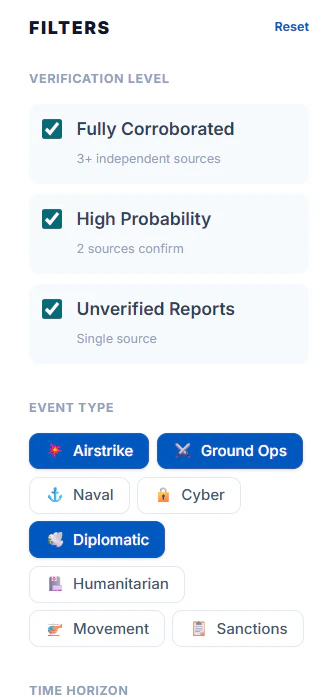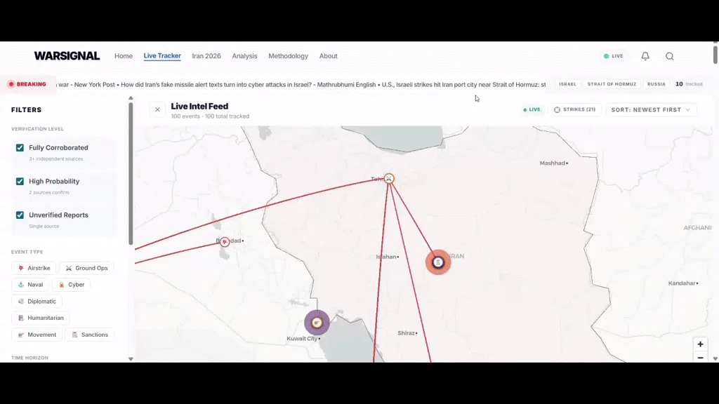 WarSignal monitors 26 news sources every 5 minutes and plots verified conflict events on a live i...
