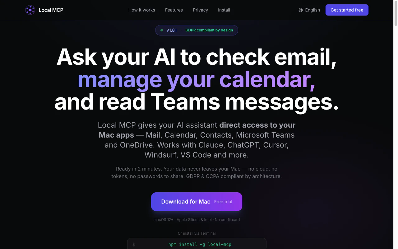 Local MCP connects Claude, ChatGPT, Cursor, Windsurf and VS Code to your Mac apps — Mail, Calenda...