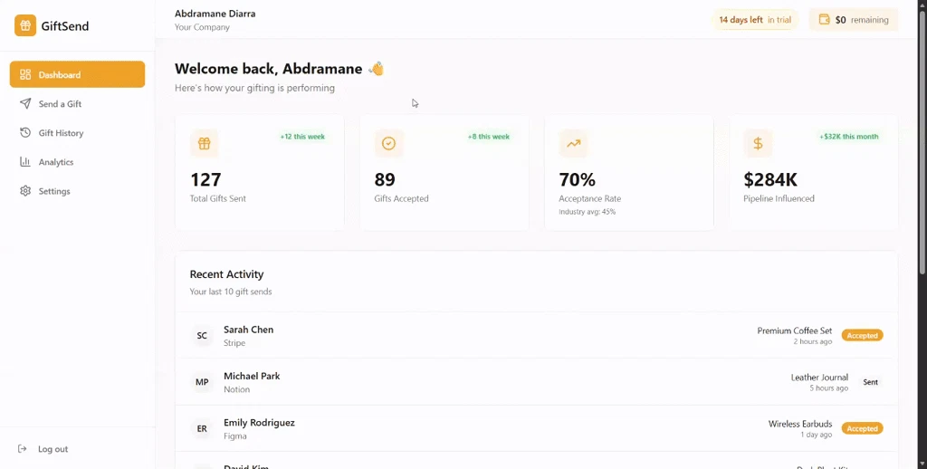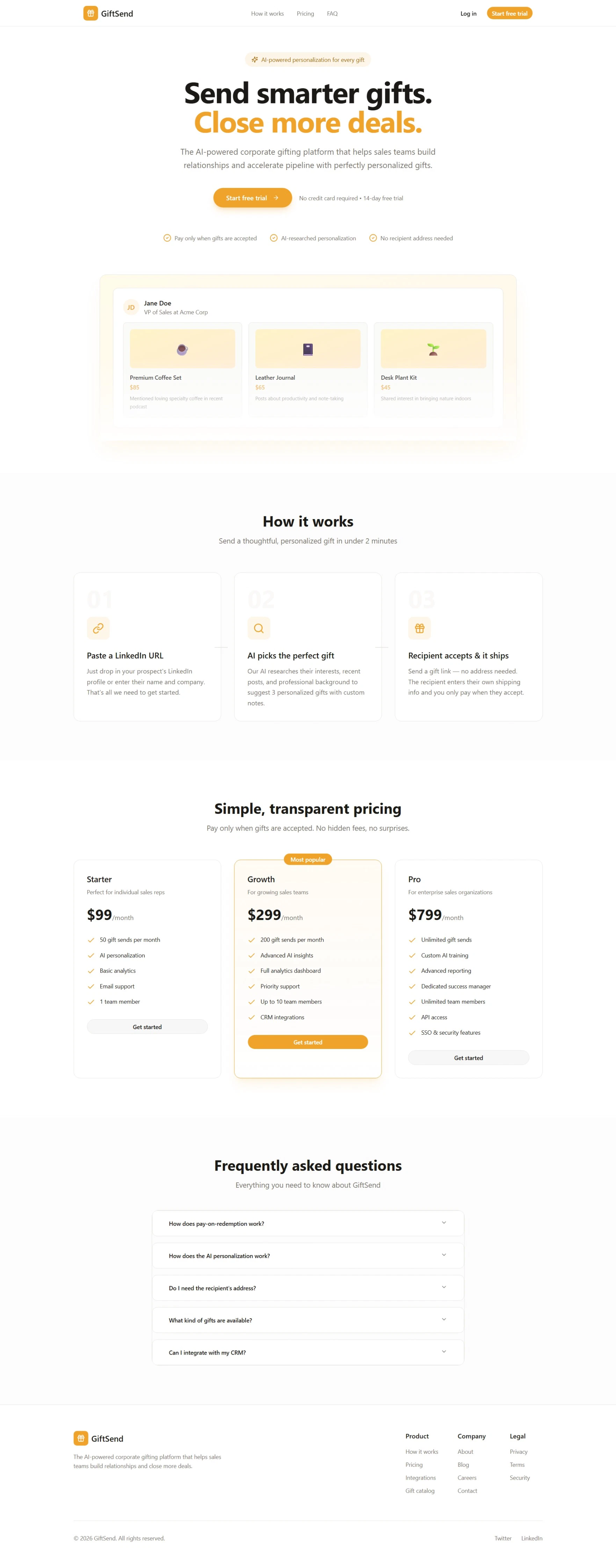 GiftSend uses AI to pick personalized corporate gifts for your sales prospects in 8 seconds. Past...