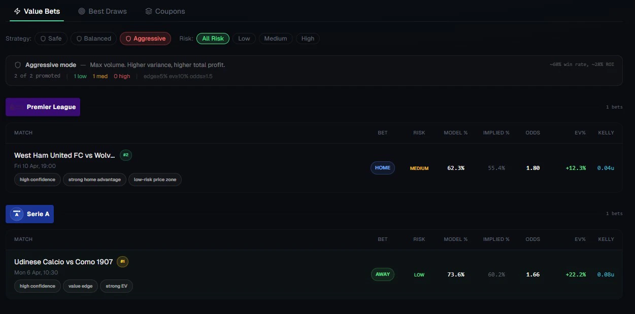 oddsly analyzes every upcoming match in Europe's top 5 leagues and tells you who to bet on — and ...