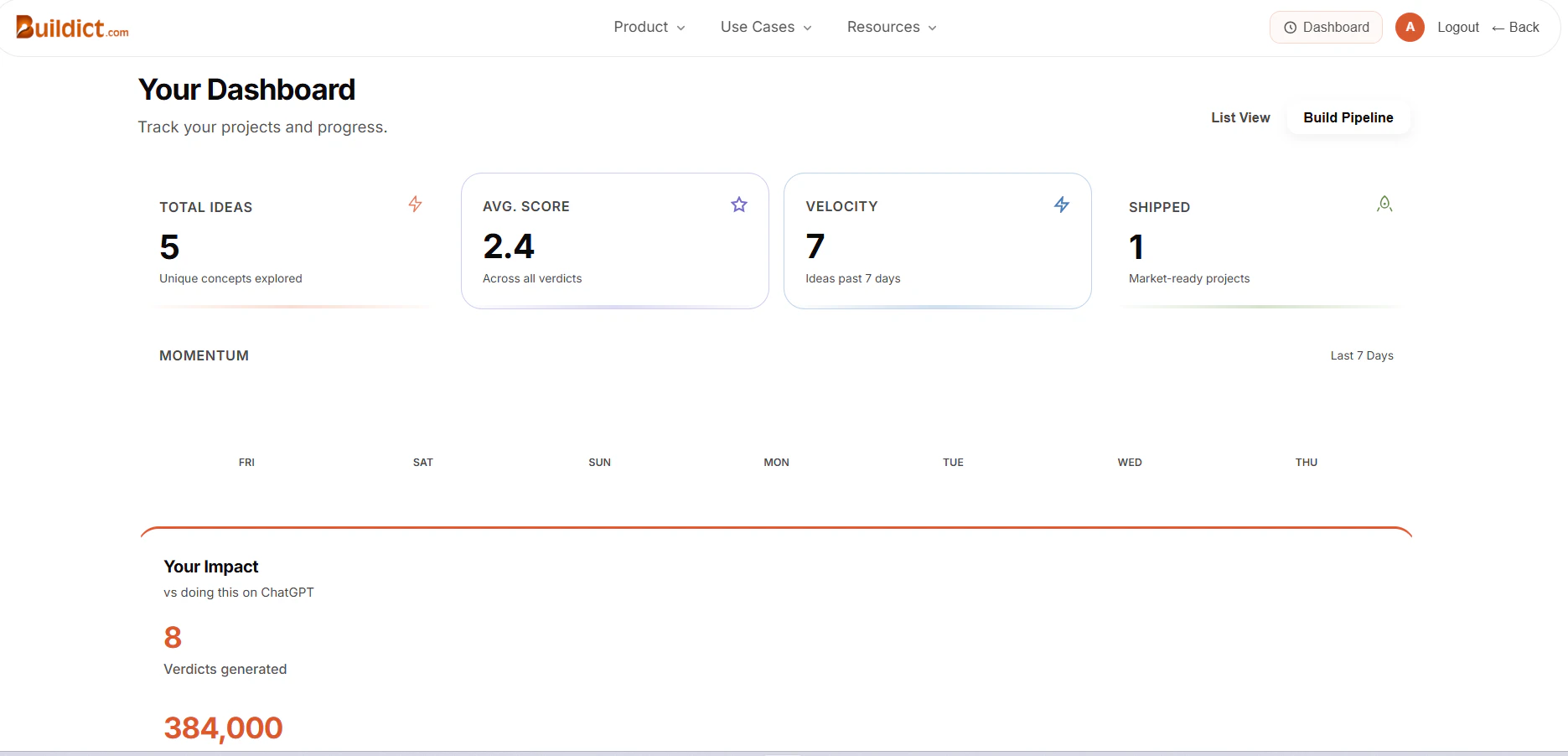 Stop ideating. Build it or kill it — today. Buildict is the AI verdict engine for founders, profe...