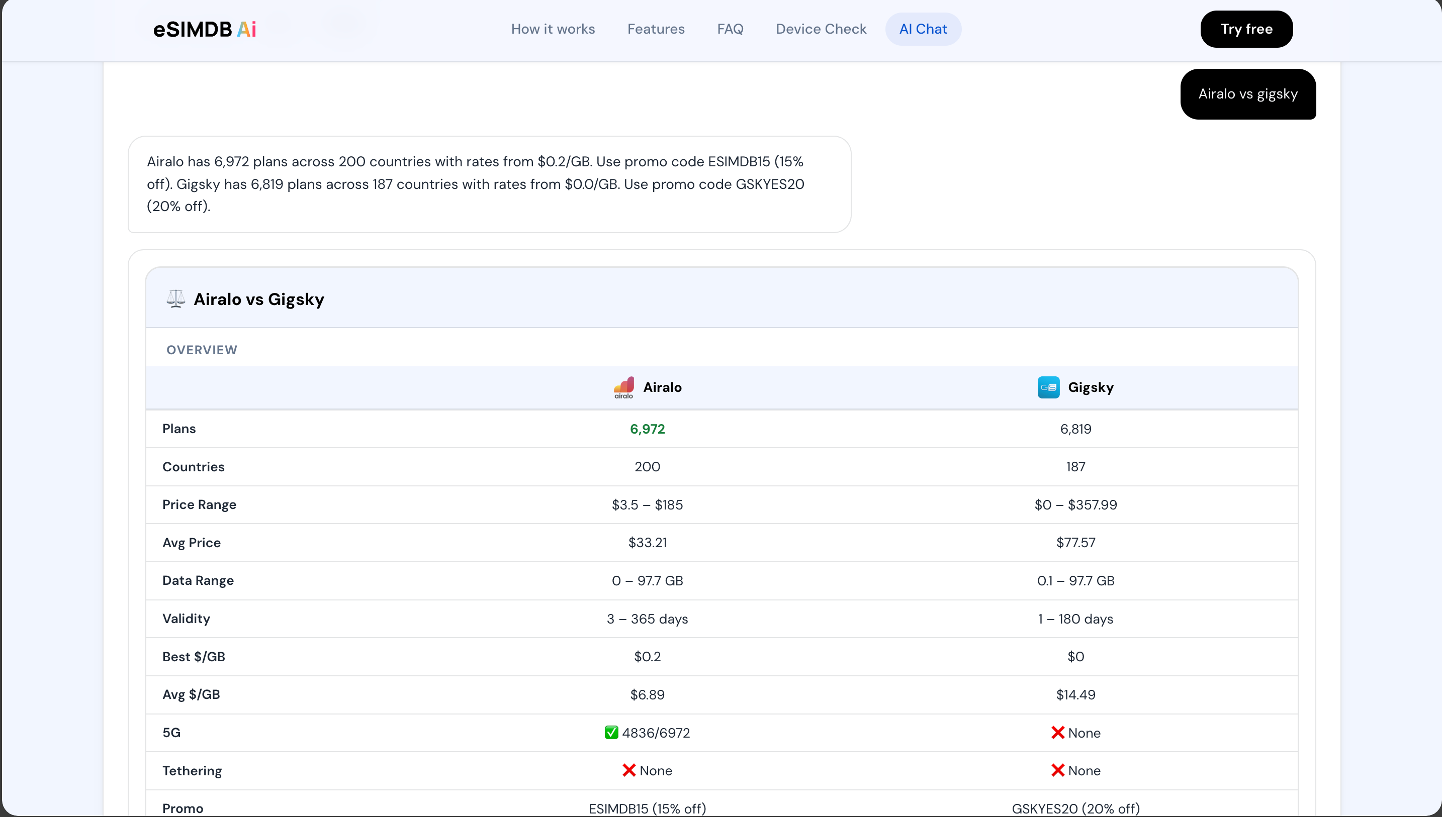 Find the best eSIM plan for your destination in minutes. AI-powered comparison across 120+ provid...