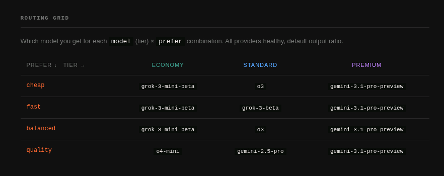 Routes LLM requests across Anthropic, OpenAI, Google Gemini, and Grok/xAI. Instead of specifying ...