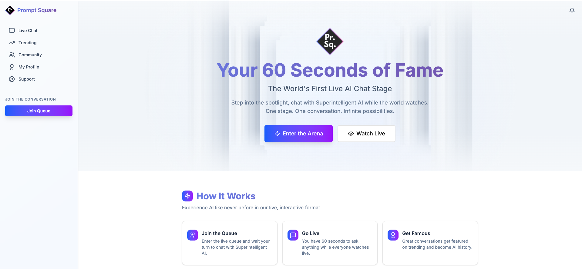 Prompt Square is a live, public AI stage where anyone gets 60 seconds to chat with AI while the w...