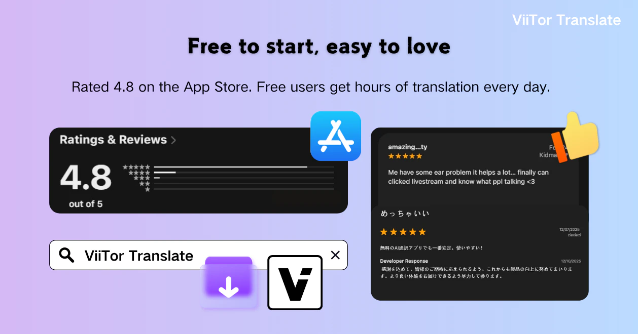 ViiTor Translate shows real-time translated subtitles over apps on your phone, so you can underst...