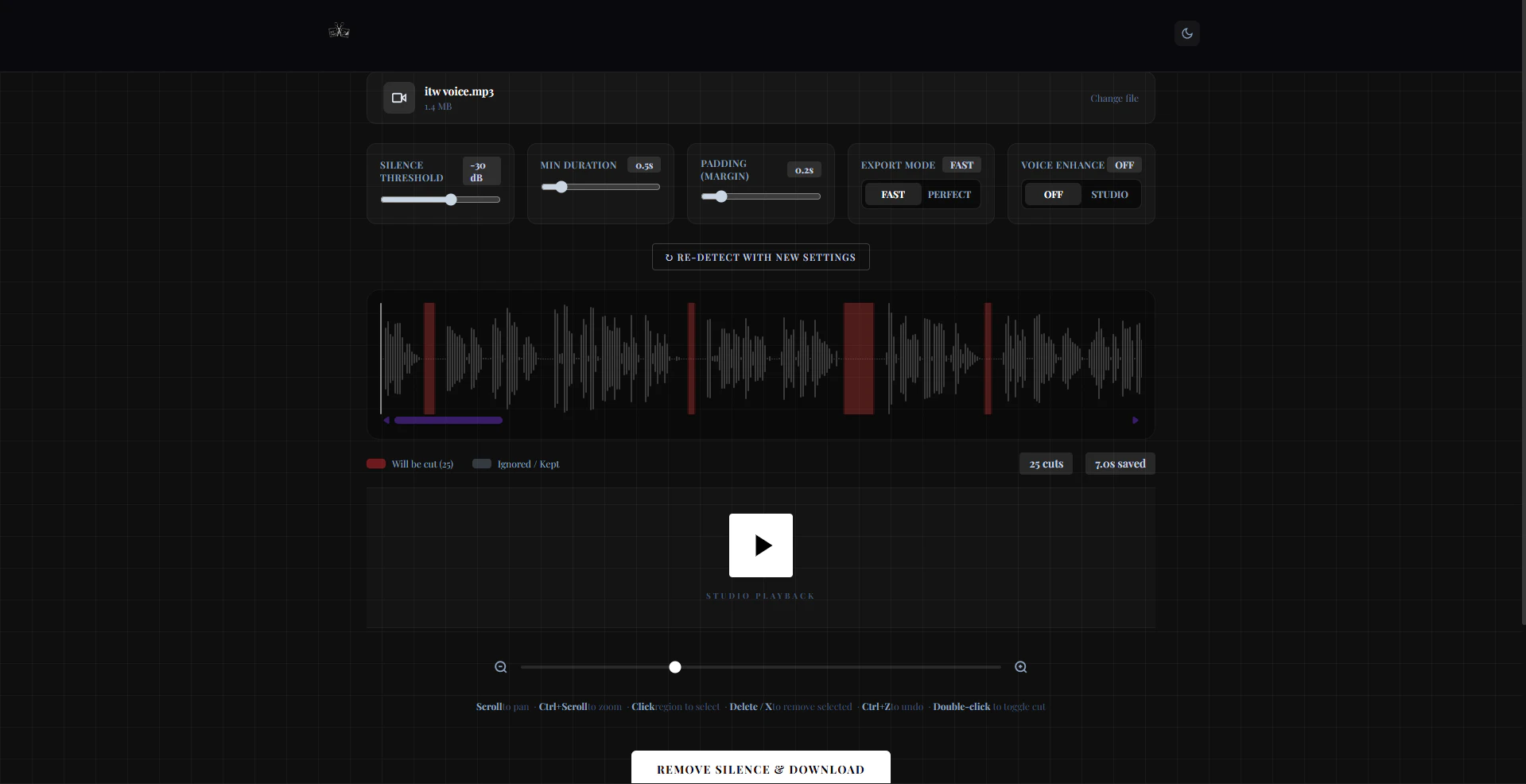 Automatically detect and remove silent sections from your videos. 100% client-side processing — y...