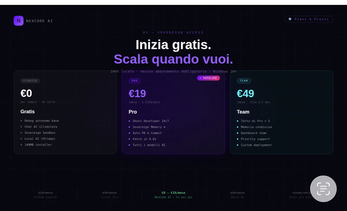 NexCode AI — debug autonomo, Ghost Developer, Sovereign Sandbox. L'AI che non consiglia: governa....