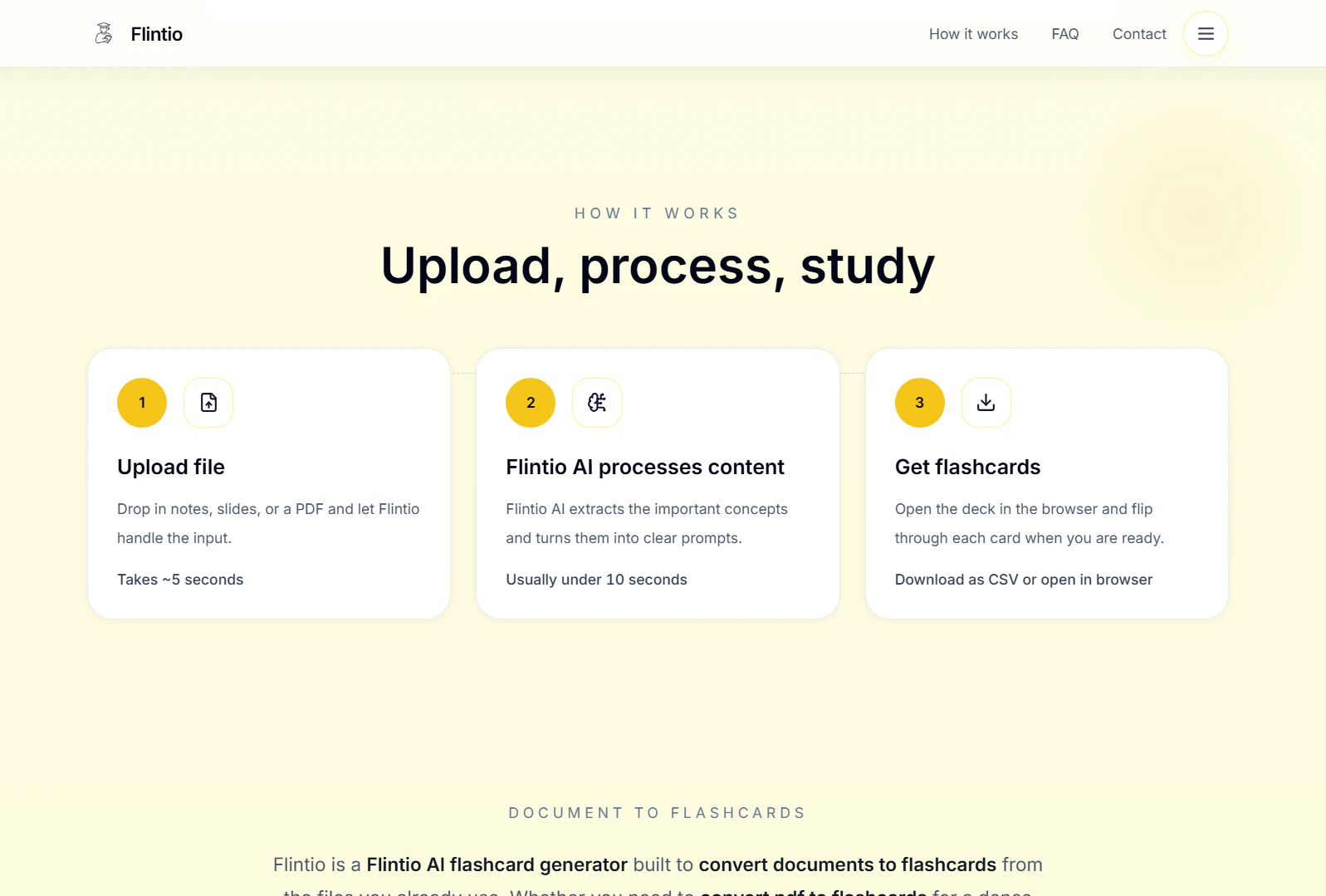 Convert PDF, Word, Excel, and PowerPoint files into flashcards instantly with Flintio AI. Upload ...