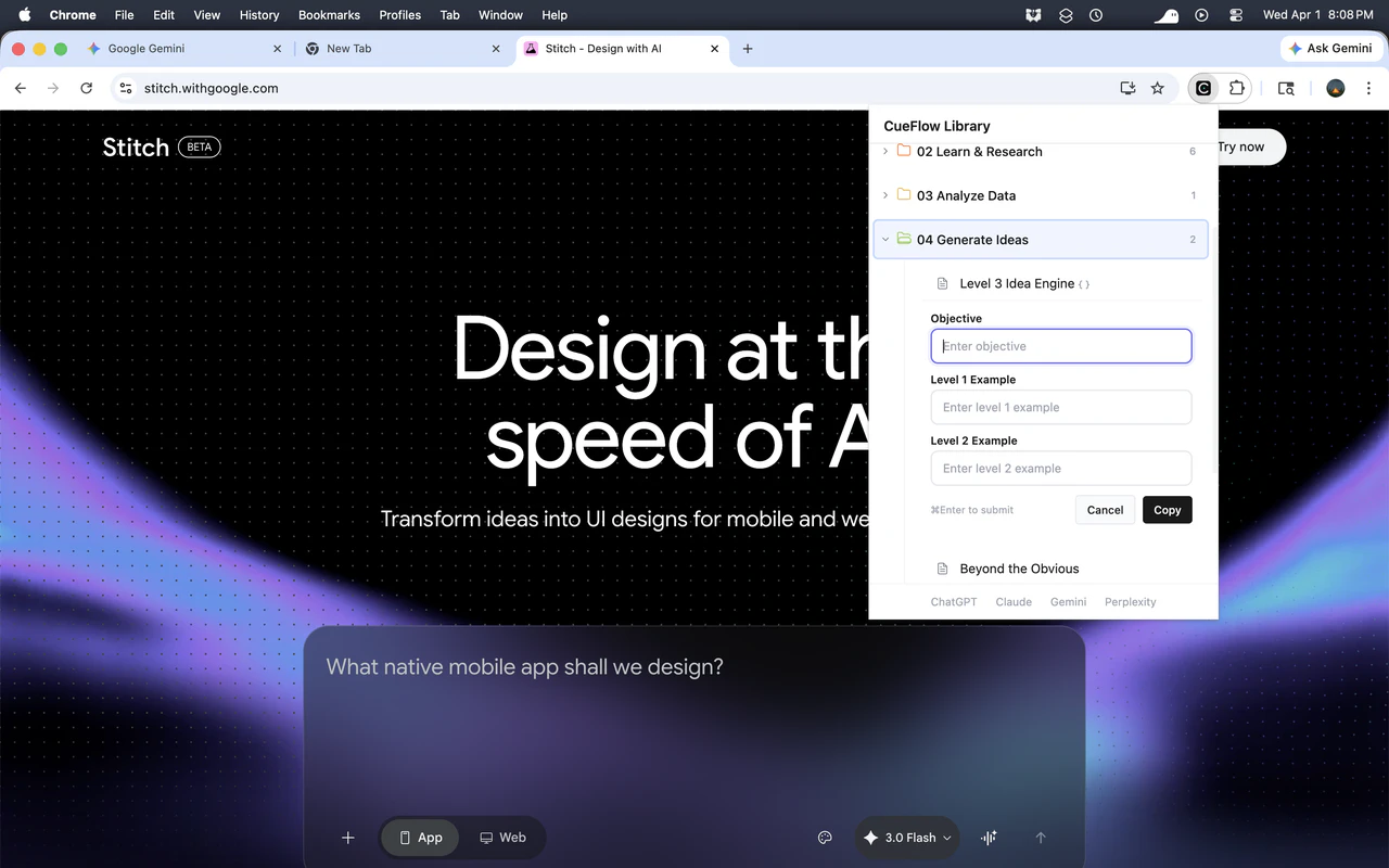 CueFlow is a Chrome extension that injects a prompt library sidebar into ChatGPT, Claude, Gemini,...