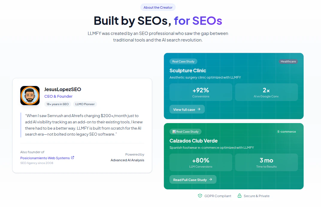 AI Overviews steal 20%+ of organic traffic. LLMFY audits the signals AI uses to cite sources — E-...