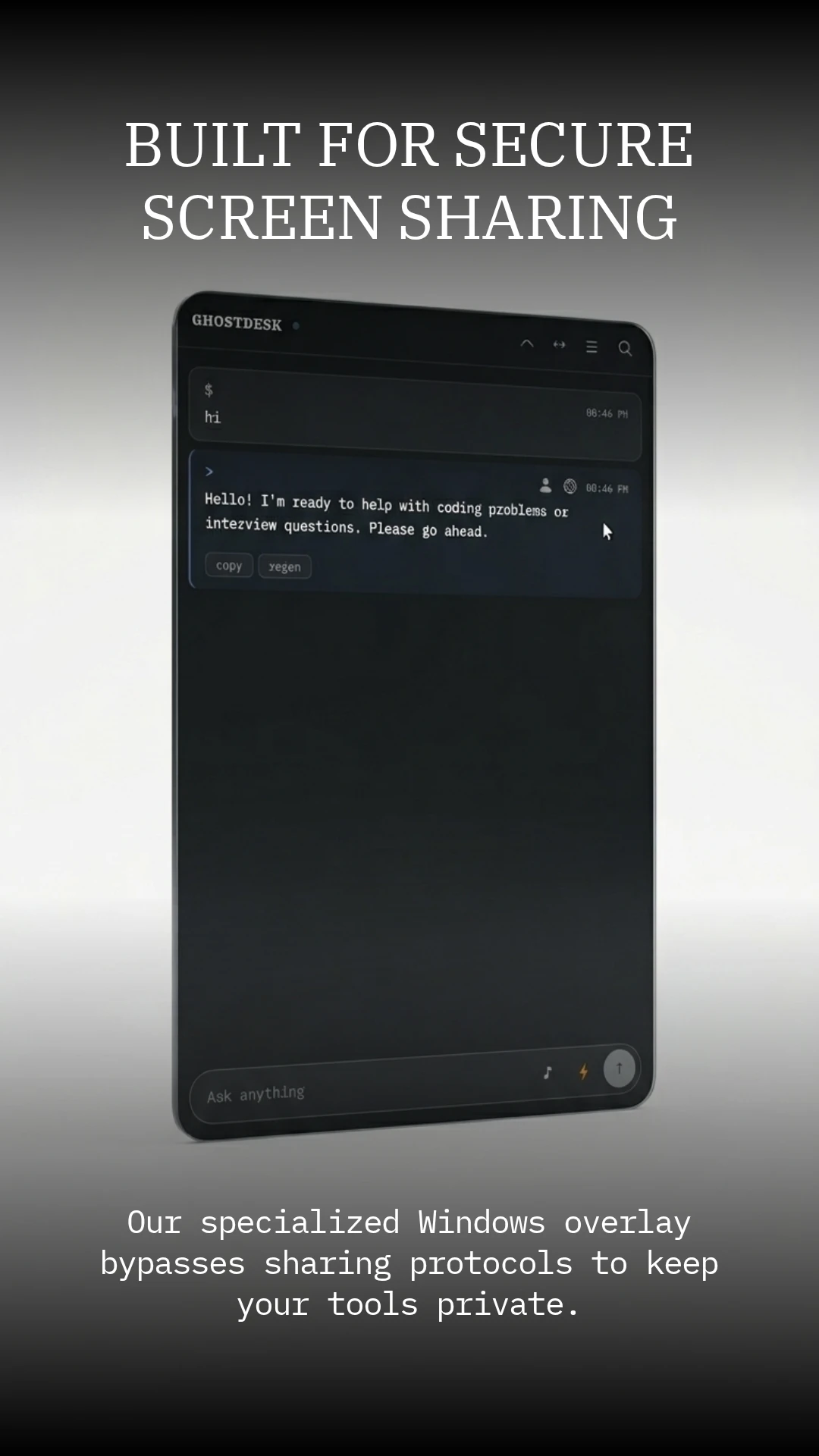 GhostDesk 2.0 is an invisible Windows AI overlay that is invisible to any screen recording softwa...
