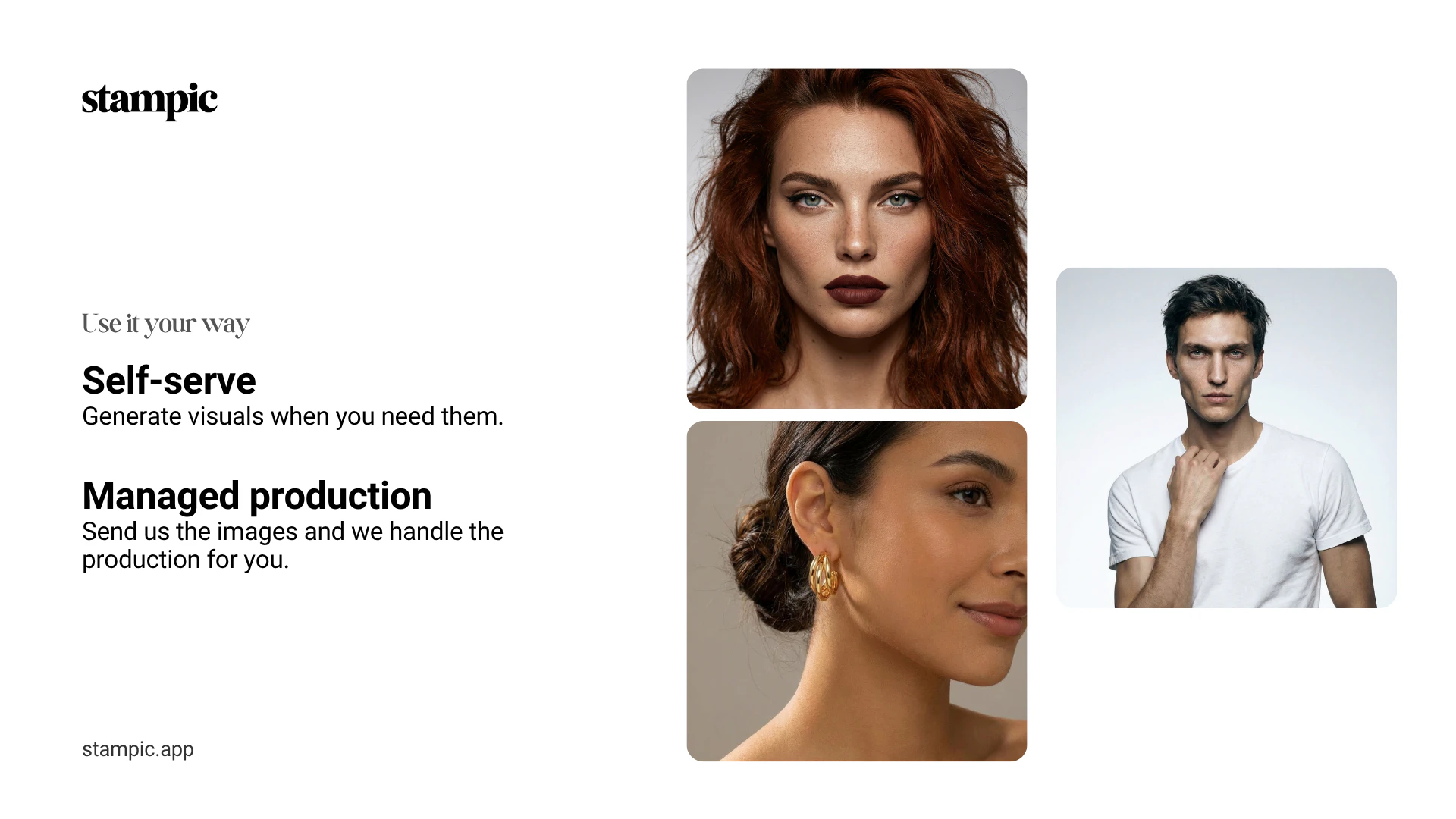 Stampic turns a single clothing photo into ecommerce-ready fashion visuals. Create on-model image...