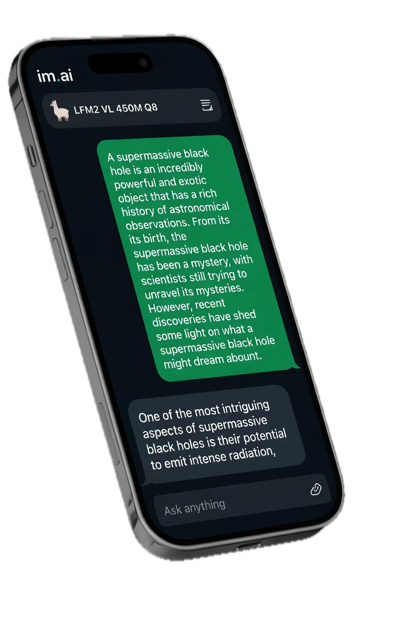 im.ai is a small chat app for iOS and macOS. It runs local models (Llama, Gemma, Qwen) on-device ...