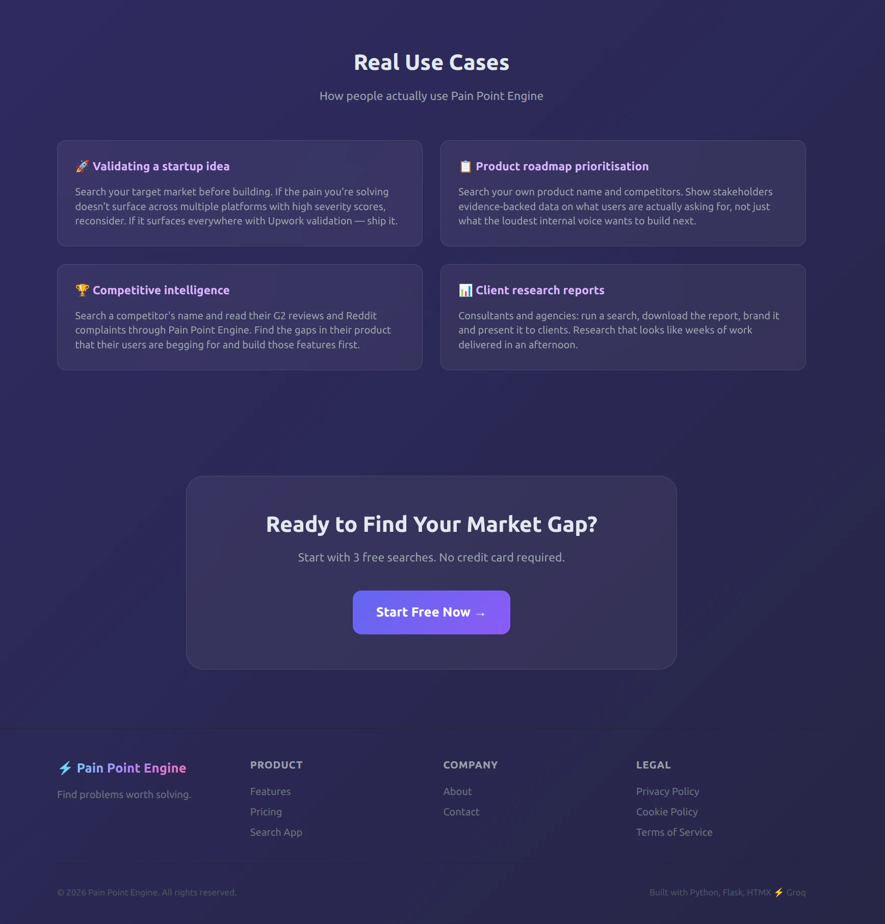 Pain Point Engine scans Reddit, Hacker News, GitHub, Stack Overflow, G2, Capterra, Upwork and Goo...