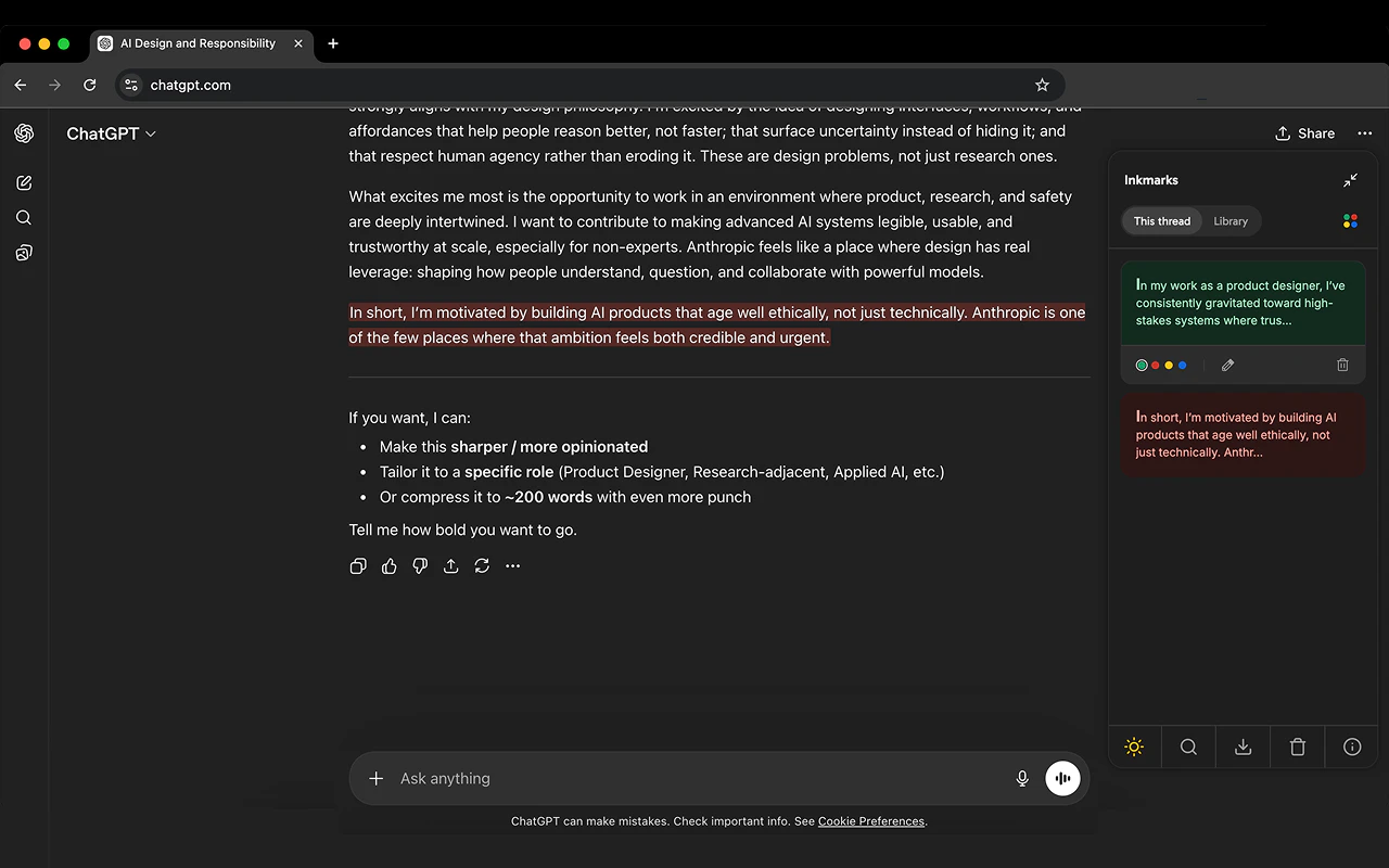 Inkmarks helps you highlight useful parts of AI conversations and return to them later. Instead o...