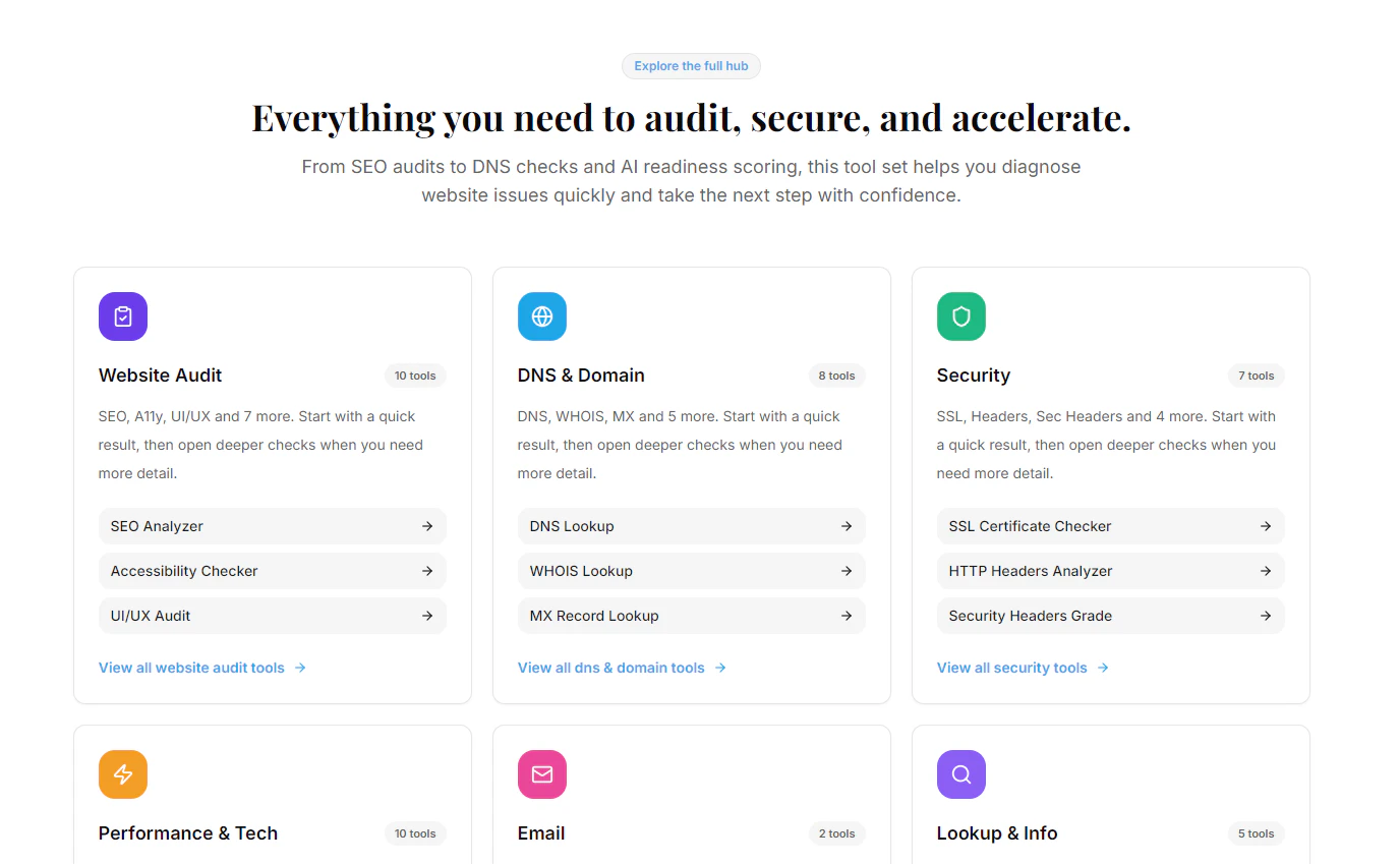 CheckWebs unifies 62 free website utilities in one hub instead of forcing you to bounce between s...