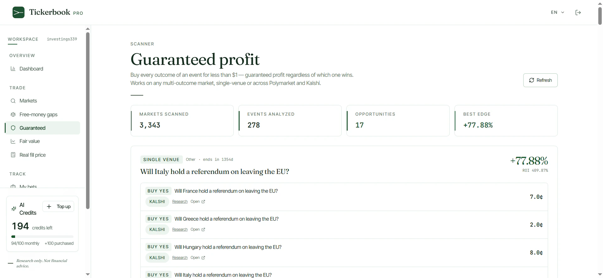 Research and decision-support terminal for prediction markets. Cross-venue arbitrage, multi-outco...