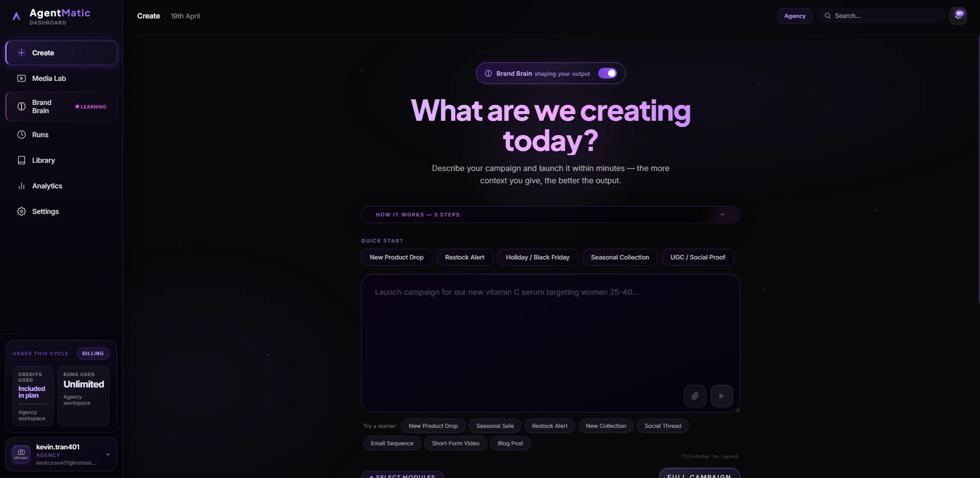 Agentmatic generates your entire product launch campaign from a single brief — marketing copy, pr...