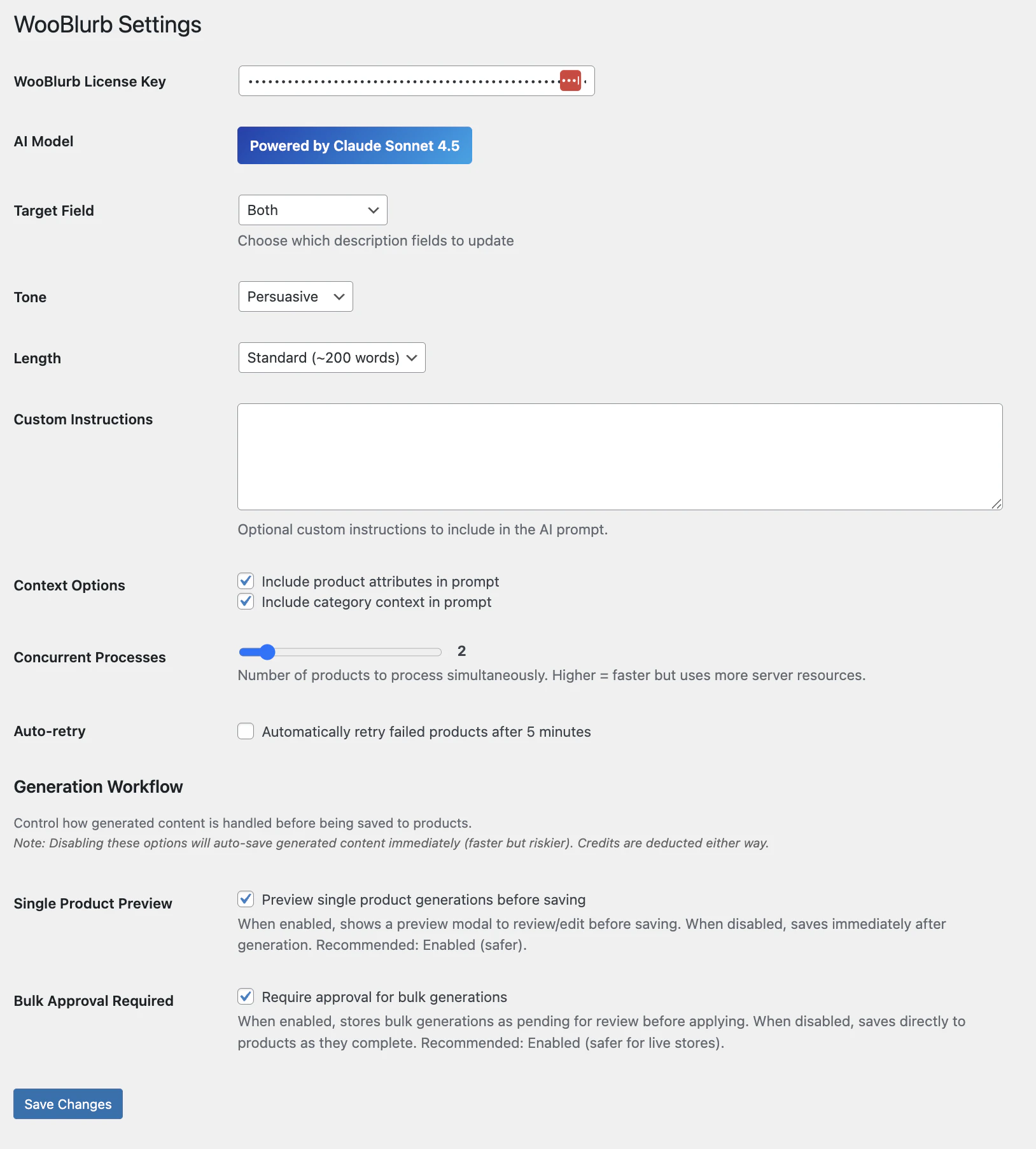 Stop writing product descriptions manually. WooBlurb uses Claude AI to generate professional desc...