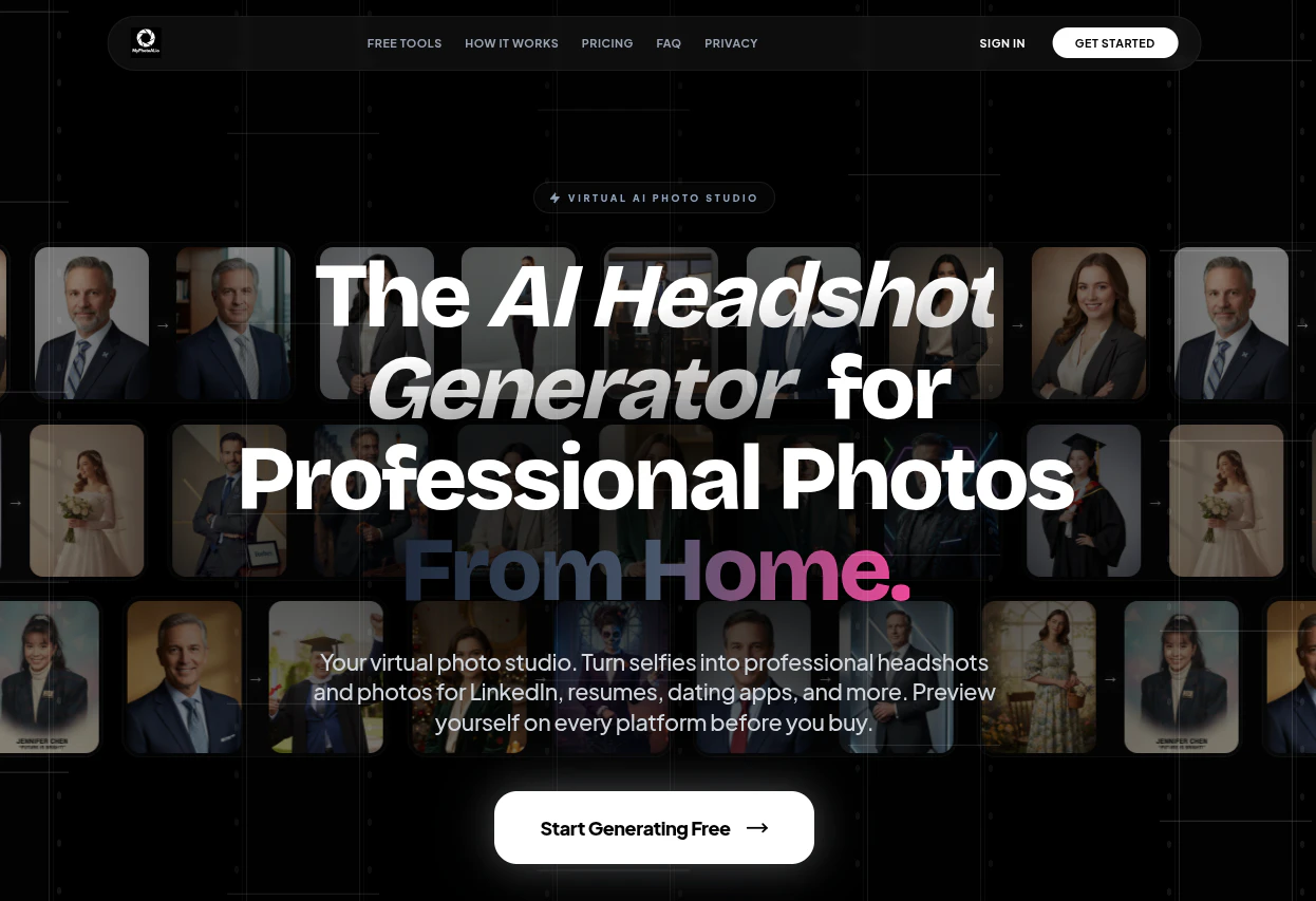 107 styled AI looks. Upload up to 15 selfies, pick a look, get back your photos plus a Brand Kit ...