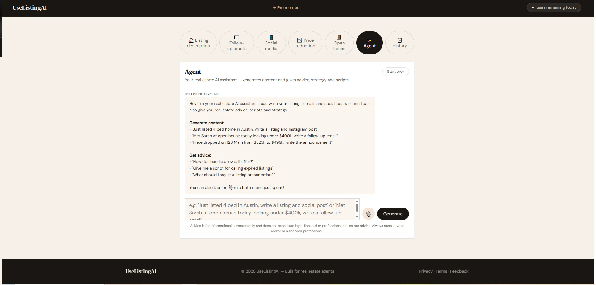 Write descriptions in seconds for Real Estate listings etc..