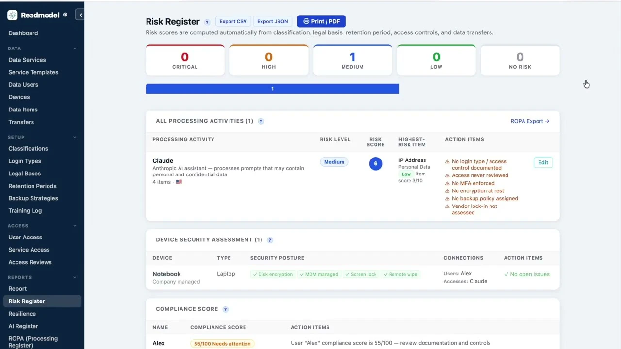 ROPA tool and data mapping to prevent data loss. Score risks, assess device security, check backu...