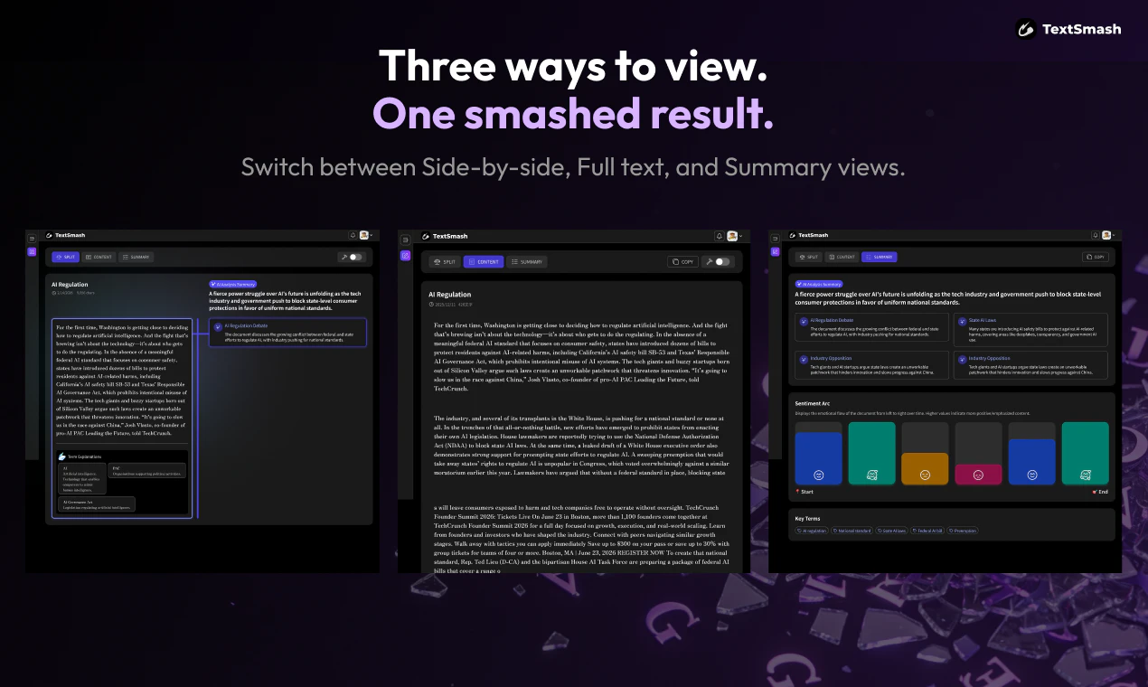 Drop any PDF, Word, Excel, or PowerPoint — TextSmash uses AI to break it down into structured str...