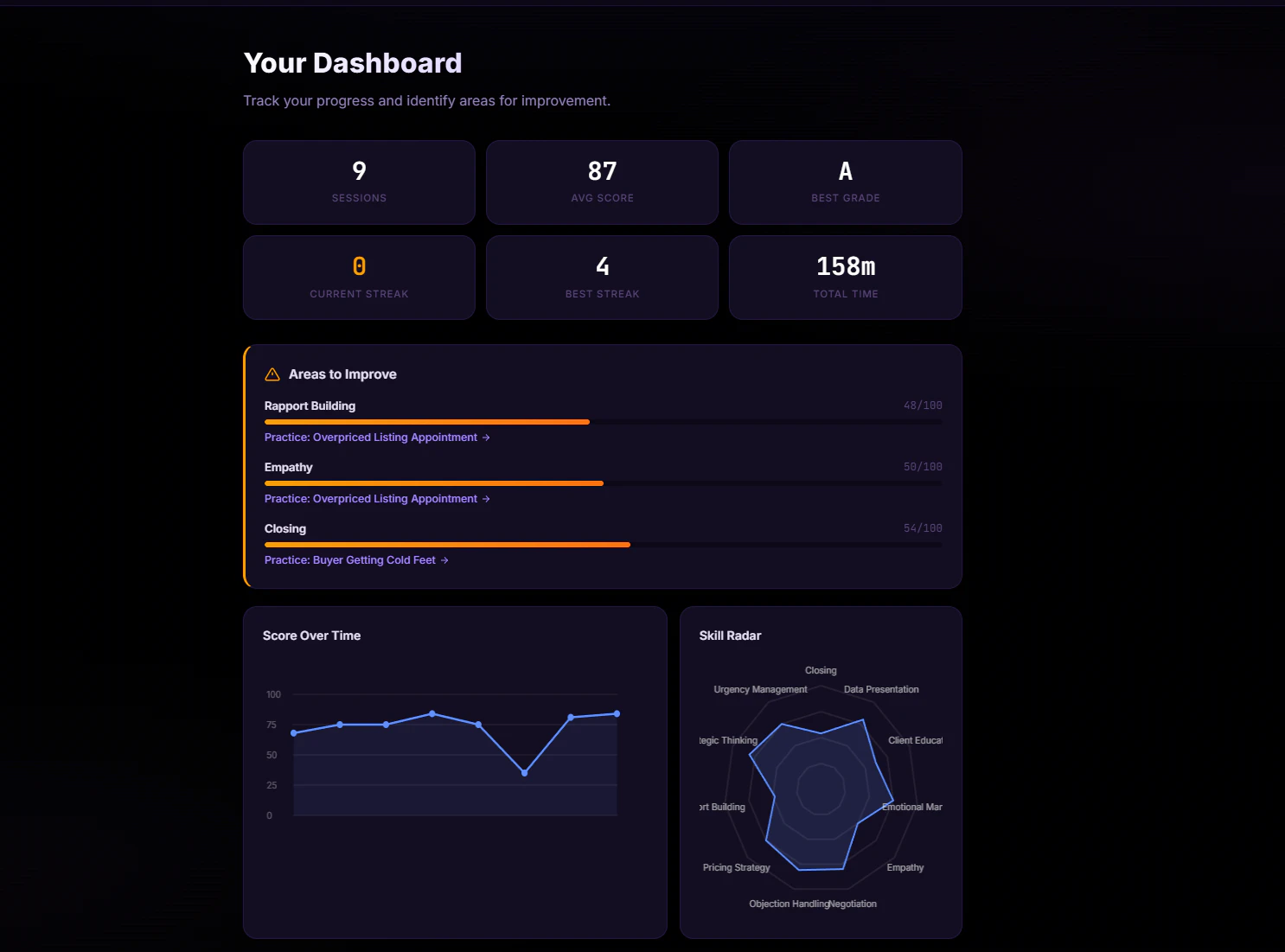 AI-powered training where real estate agents practice client conversations with realistic AI clie...