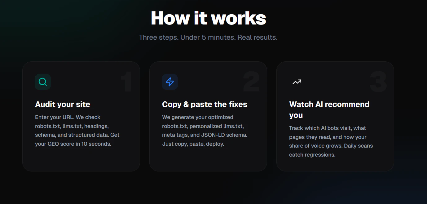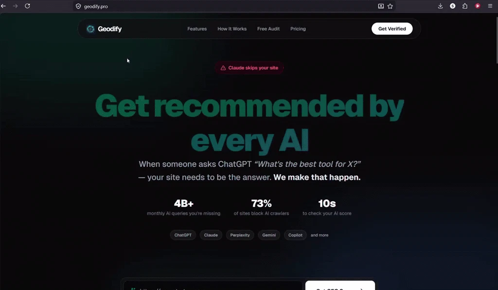 Make your website natively readable by AI. Geodify audits your site for ChatGPT, Claude, and Perp...