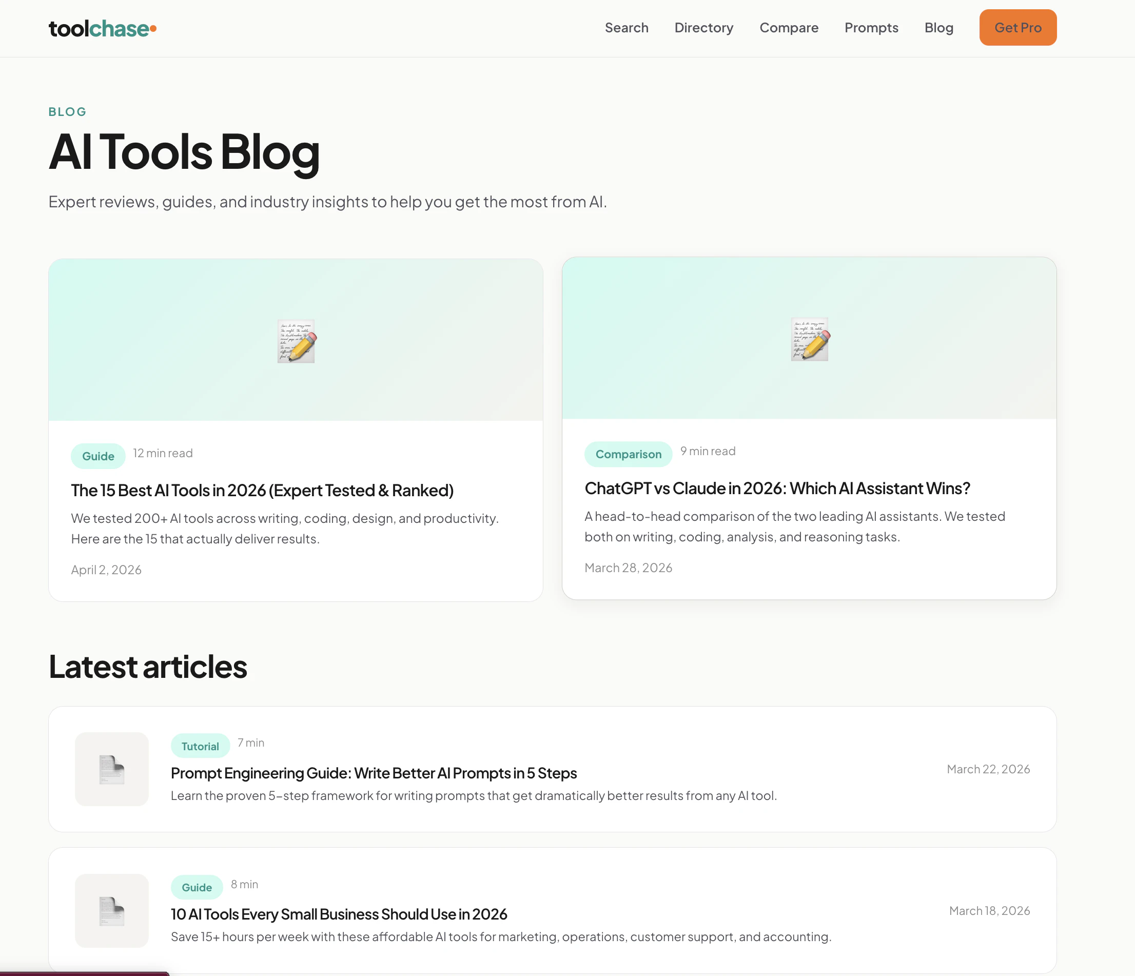 ToolChase is a free AI tools directory with 109 expert-reviewed tools, 1,900+ comparisons, and bu...