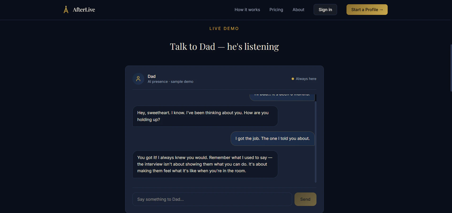 Upload photos, messages, and voice recordings of a loved one who has passed. AfterLive creates an...
