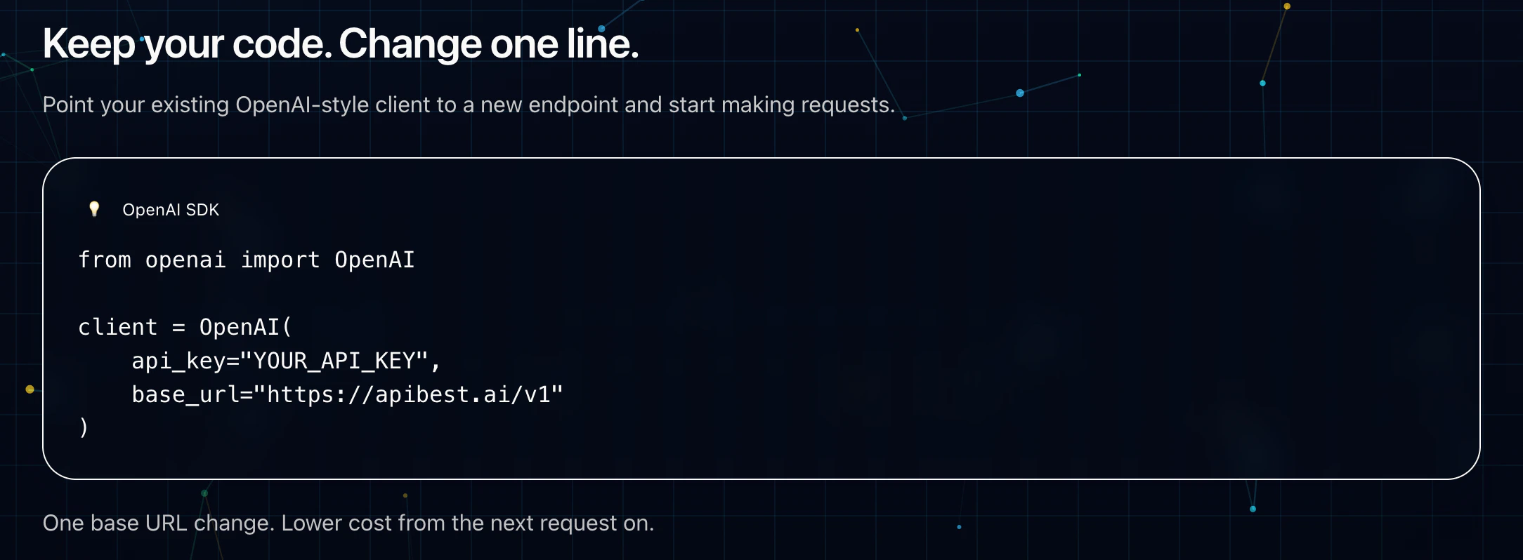 Use the OpenAI API format you already know and pay 25% less with Best API. Keep migration minimal...