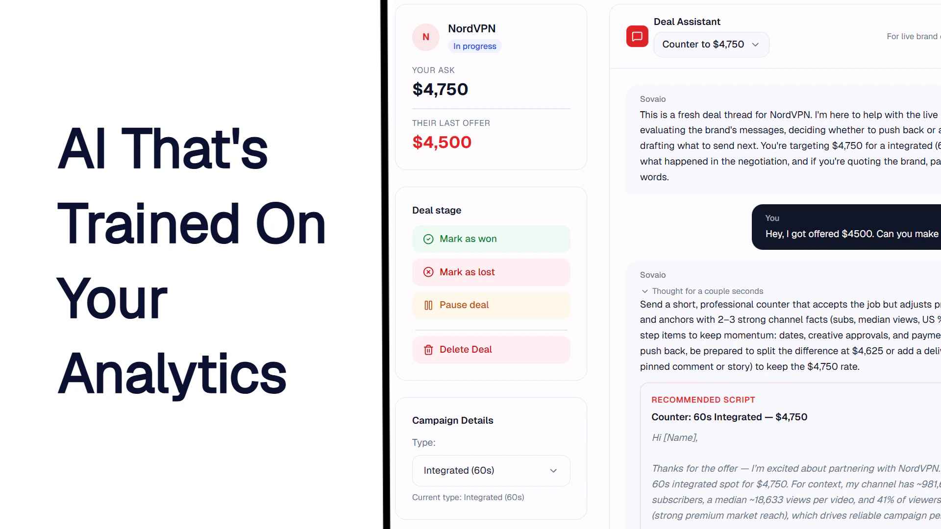 Sovaio helps YouTube creators stop guessing on sponsorship rates. Upload your YouTube Studio anal...