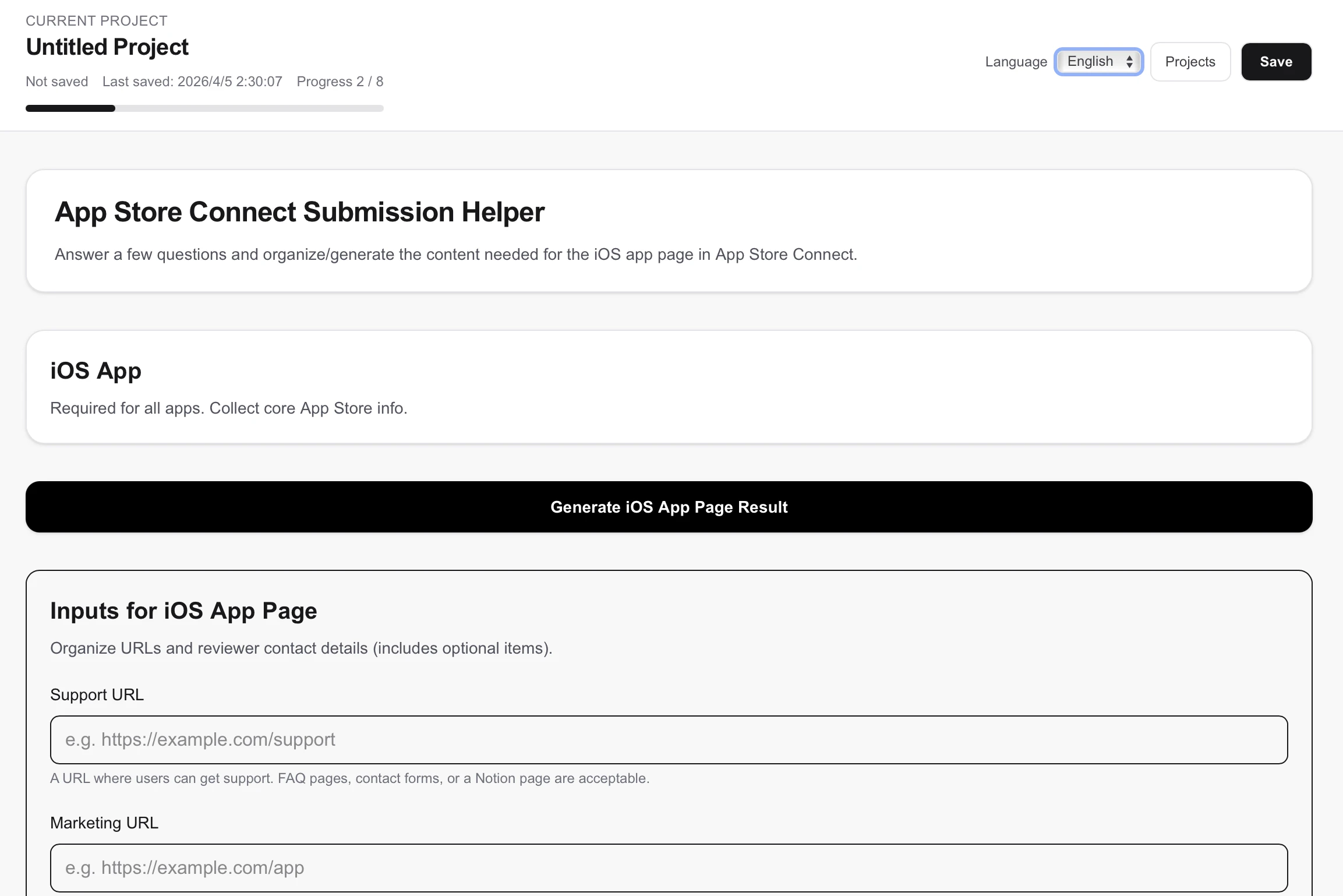 App Submit Helper helps developers prepare App Store Connect submissions with guided inputs, AI-g...