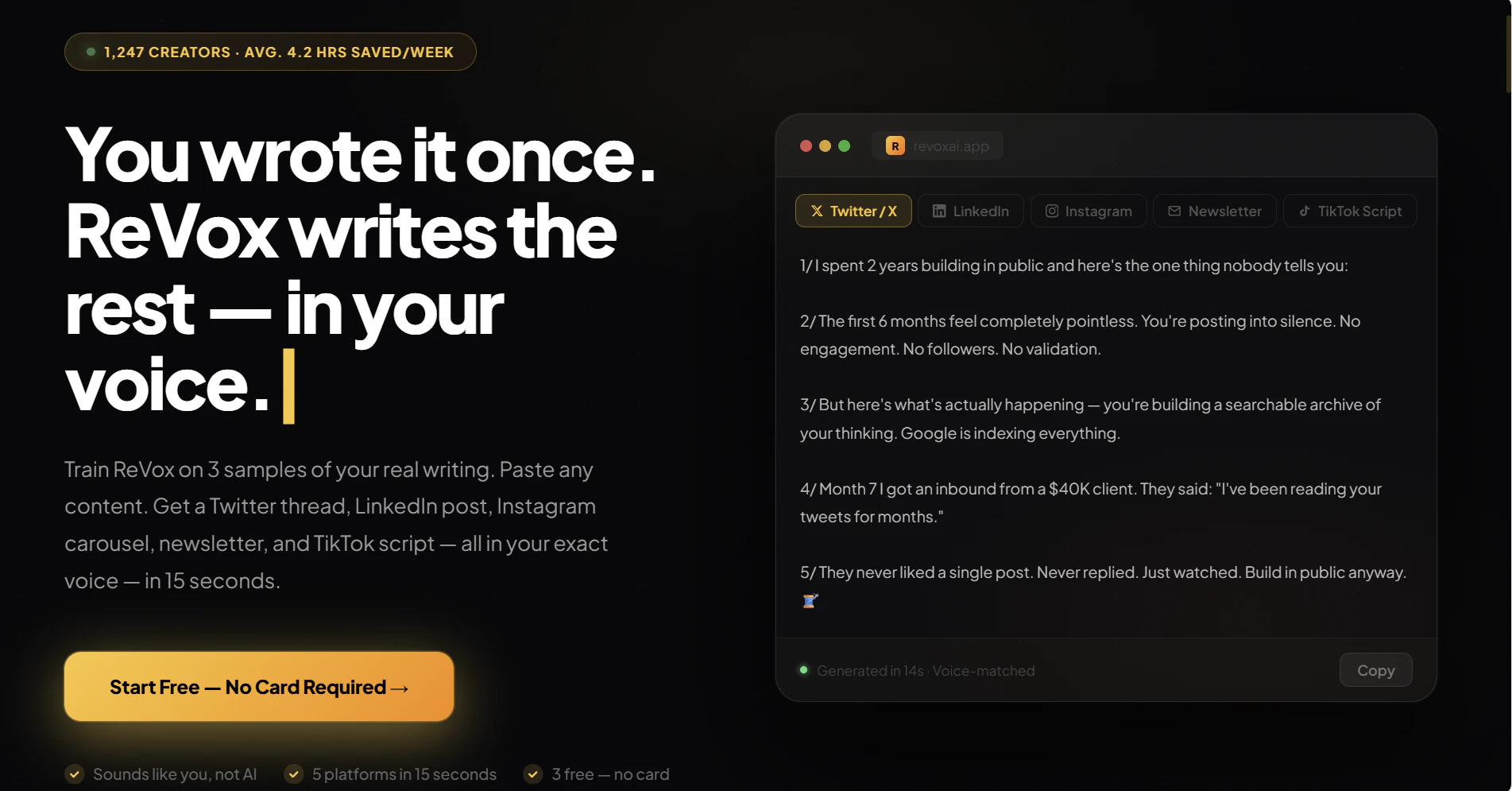 Paste any content and ReVox rewrites it for Twitter/X, LinkedIn, Instagram, newsletter, and TikTo...