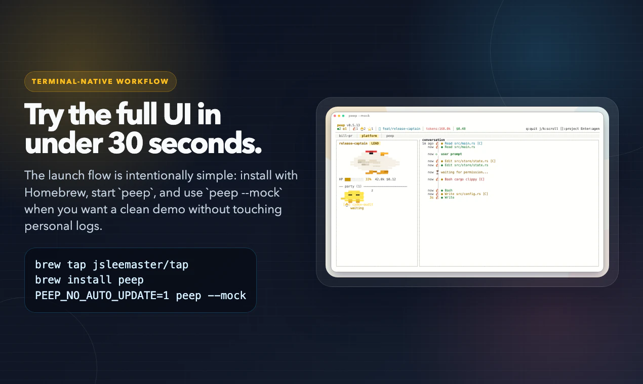 peep is a zero-config terminal dashboard for watching AI coding agents work in real time. It read...
