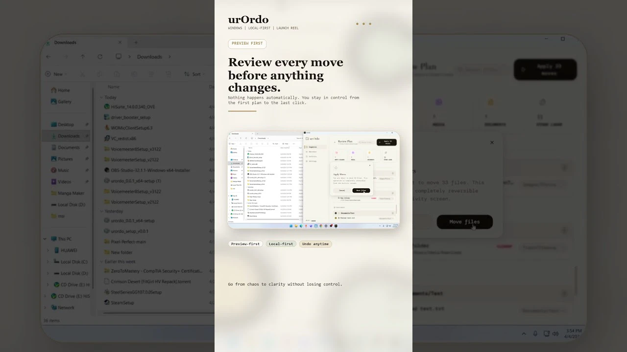 urordo is a local-first Windows file organizer that understands your files by meaning—not just na...