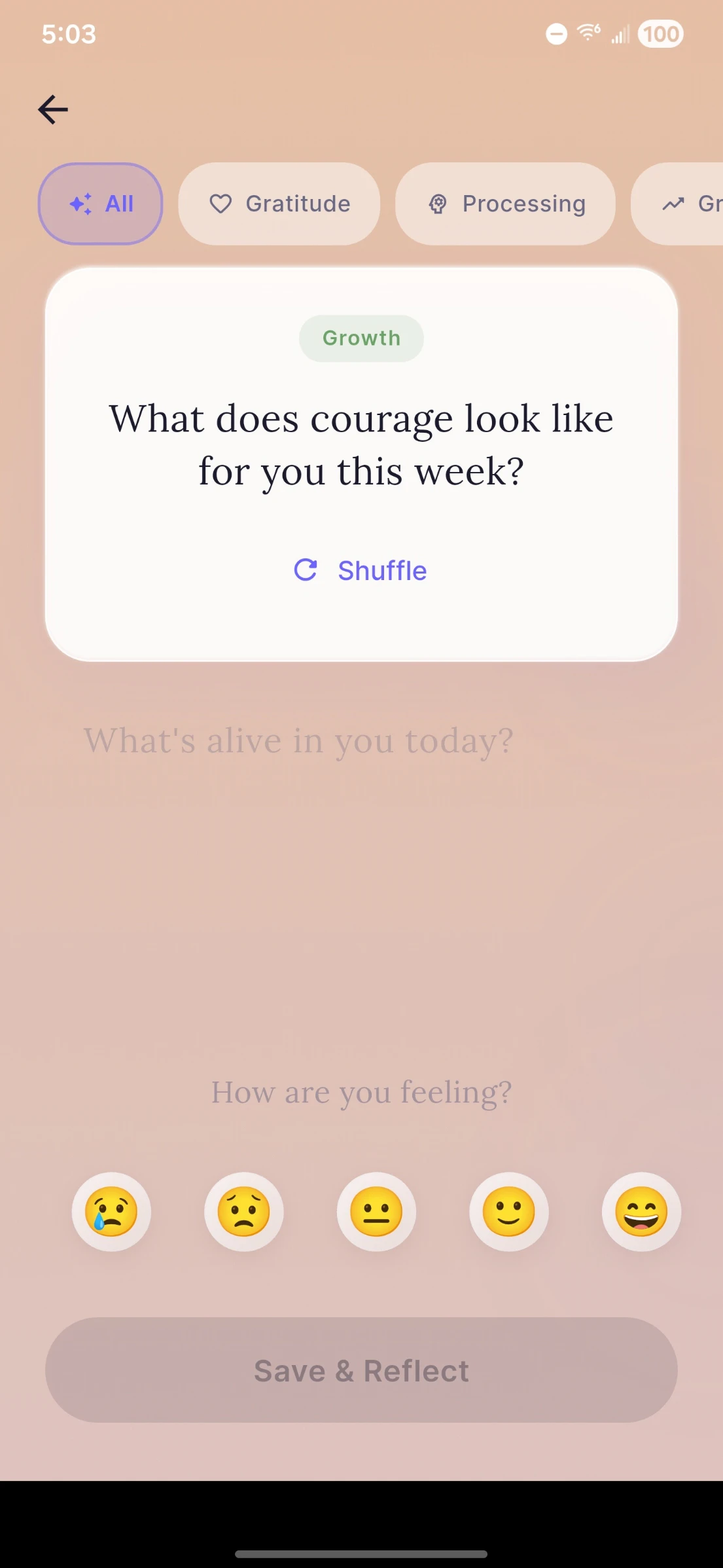 Three ways to journal: write freely, quick mood check-in, or guided prompts. After each entry, ge...