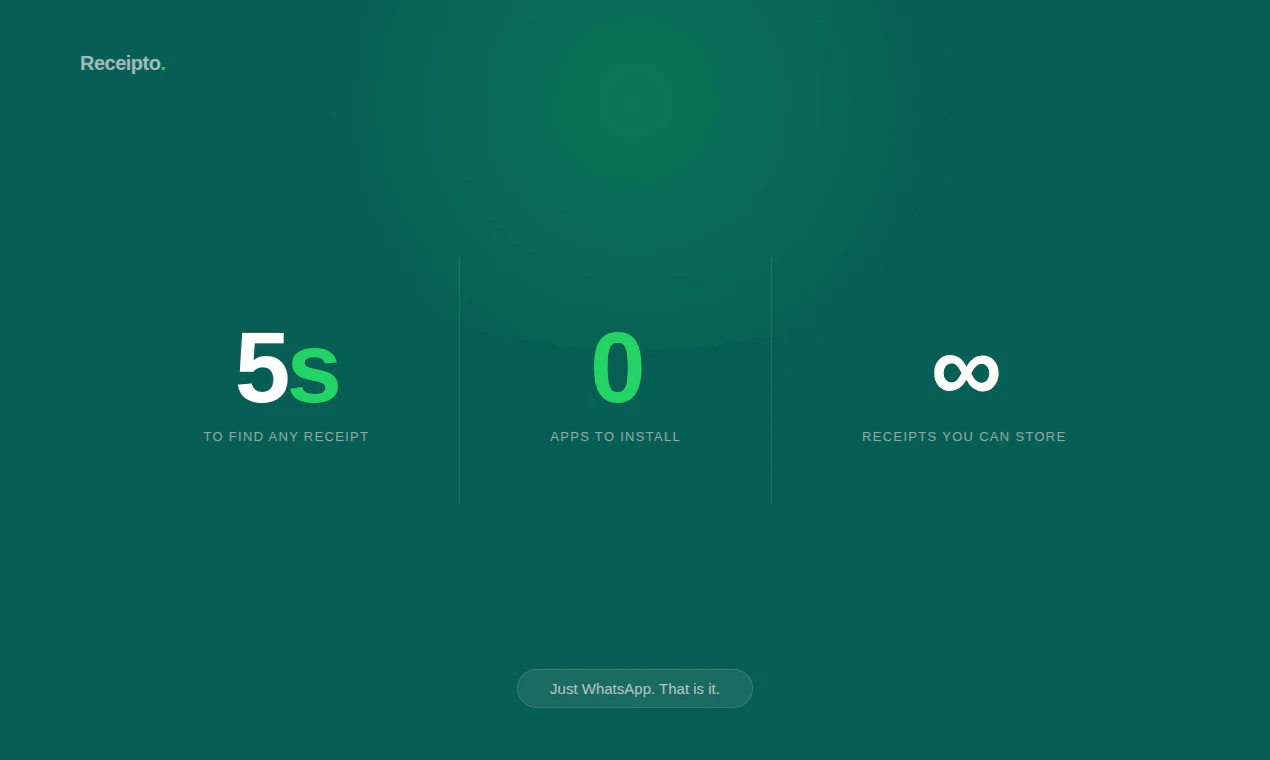 Receipto is a WhatsApp bot that stores and organises all your receipts, bills, and warranty cards. Forward any document to get started. Search in plain English, get warranty expiry alerts before it's too late, and let Gmail sync pull in your orders automatically. No app. No sign up. Just WhatsApp.