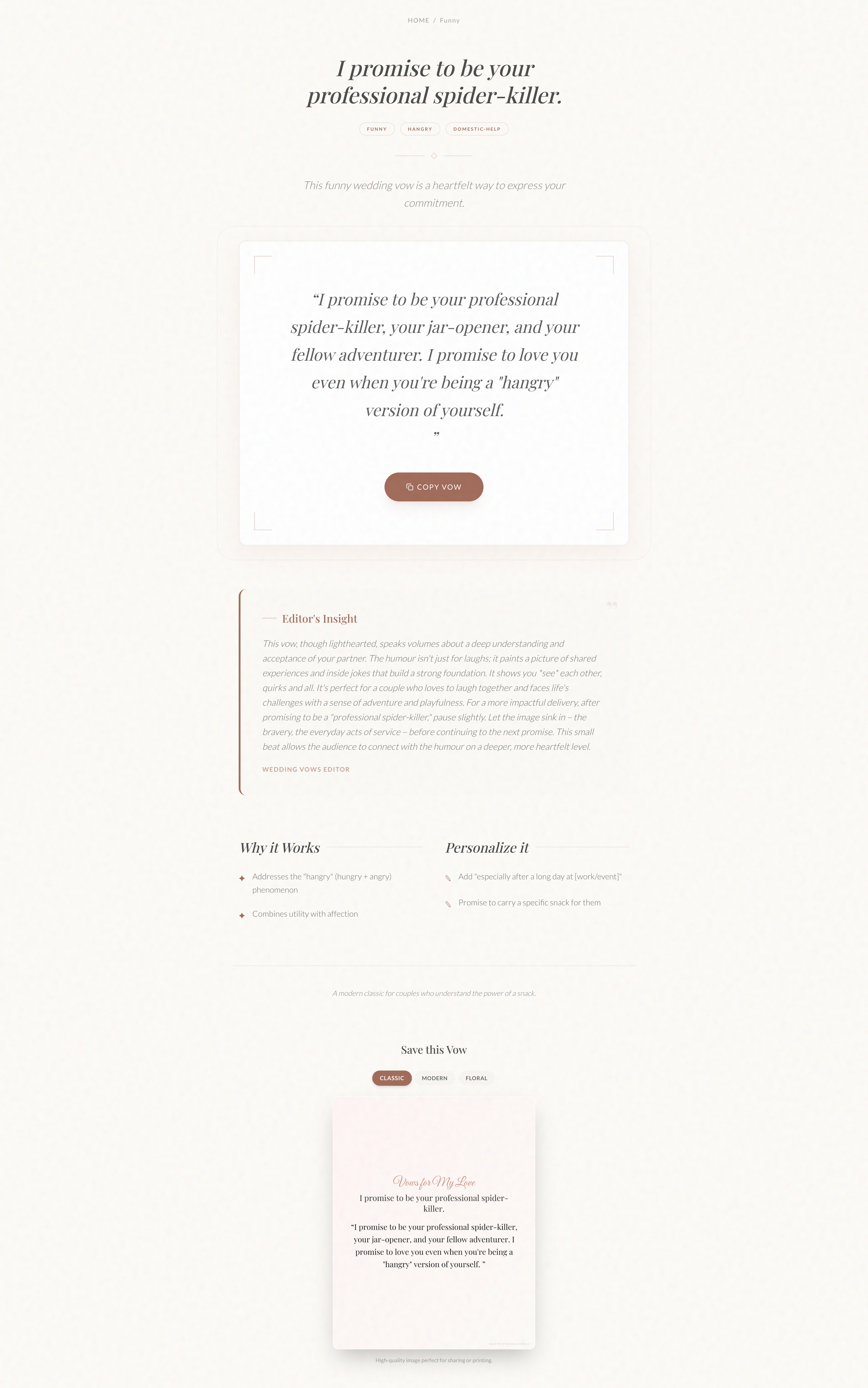 Wedding Vows AI は、結婚式の誓い作成を手軽にするAI支援ツールです。短時間で3つのドラフトを生成、ログイン不要でパートナー名を入力するだけ。100件超の実例ライブラリとセレモニー用カード生成を組み合わせ、創作のハードルを低くします。トーンはロマンチック/面白い/伝統的などに即席対応。作者は作家のブロックを解消する体験を提供し、摩擦を最小化する設計を重視しています。無料で使える点、追加課金の障壁がない点も強調しています。