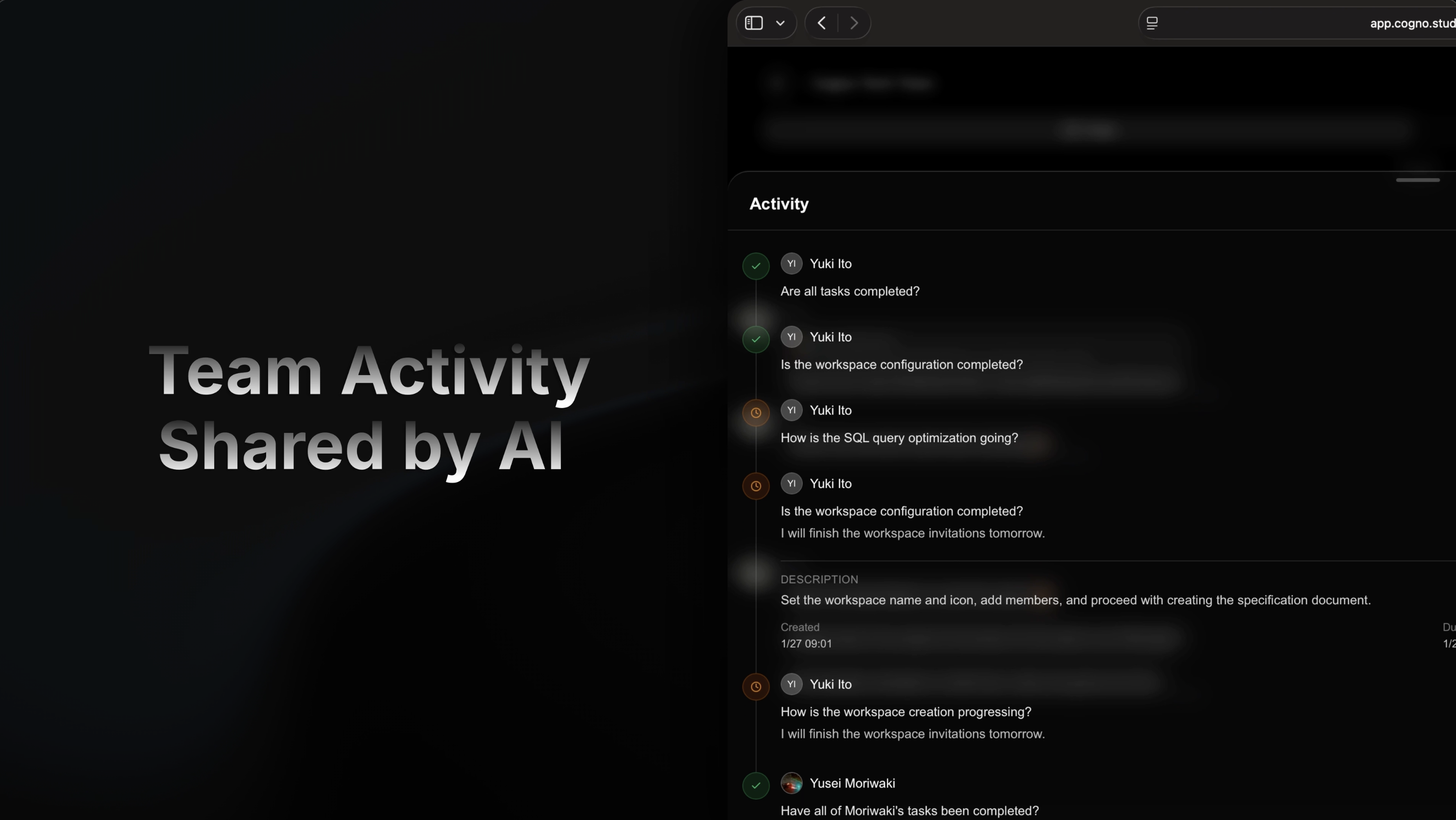 Cognoはプロンプト不要で自律的に動作するAIワークスペース。AIが通知・進捗管理・完了タスクの提供を担い、チーム全体の進捗を一目で把握できる。人間の介入を前提とせず、AIが先に行動する世界を目指す。今後はカレンダーやGitHub、メモ、医療データ等と連携し、仕事と生活の多くの場面で出発点をAIに委ねる。