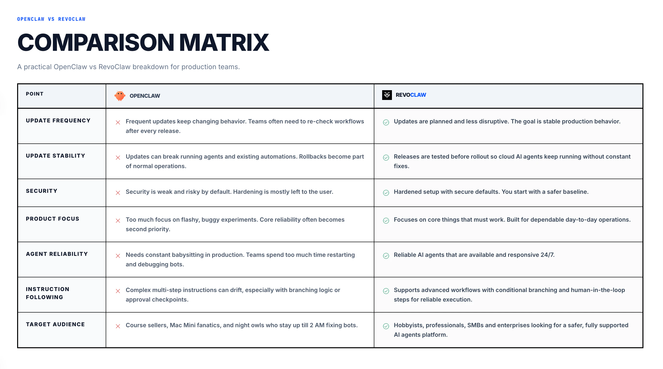 RevoClaw helps teams run AI agents in production: every agent runs in isolated containers with strict runtime policies, BYOK, audit trails and safe automation. It supports multi-user operations with role-based access, orchestrator-worker teams, browser and coding agent automation, Discord/Telegram/WhatsApp integrations, schedules, workflows, custom skills, MCP servers, and even adaptive learning. This is the OpenClaw-like platform businesses have been truly waiting for!