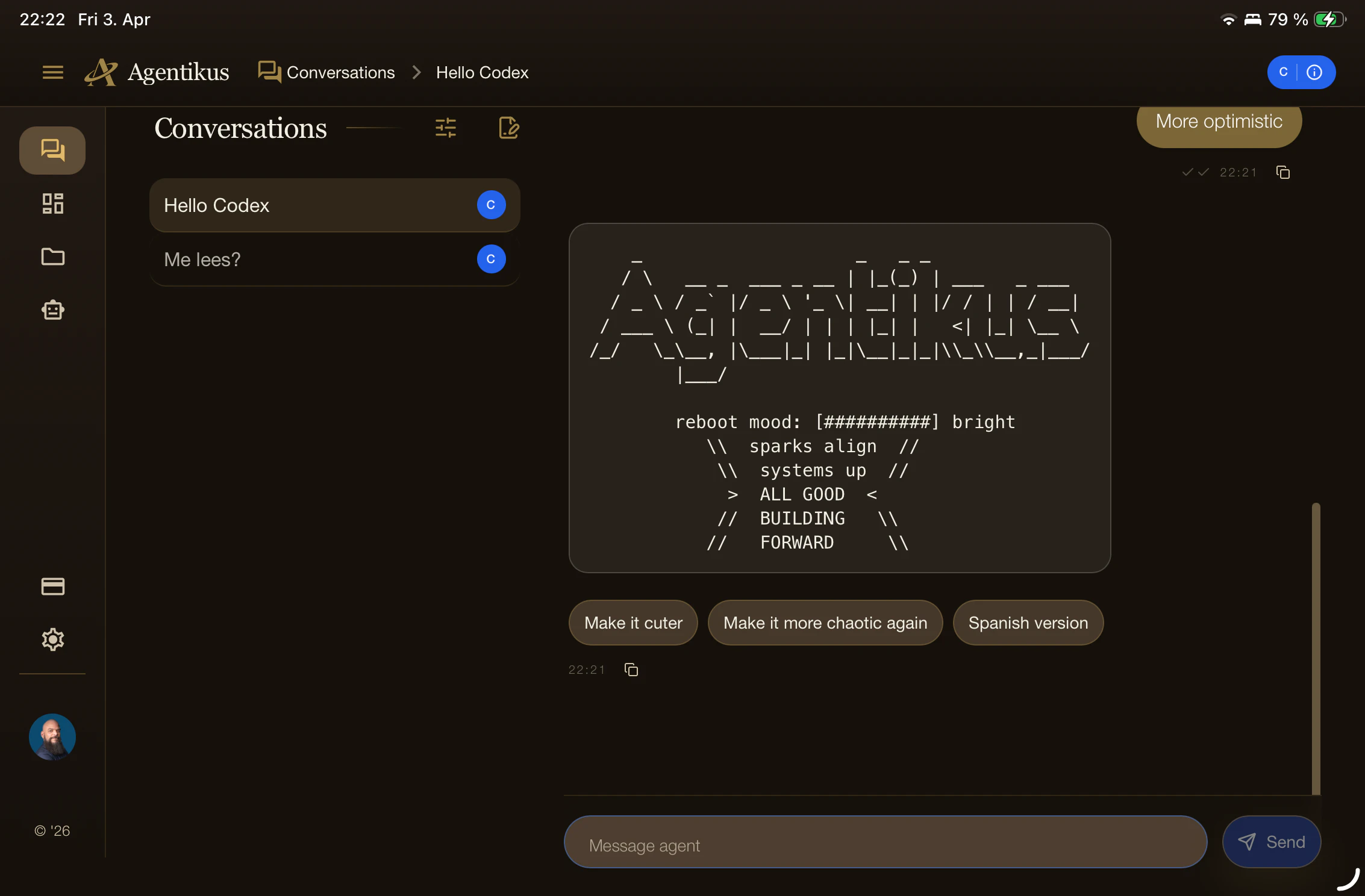 Agentikus is a control interface for autonomous agents. Send instructions, exchange files, and monitor AI agent activity from one place.