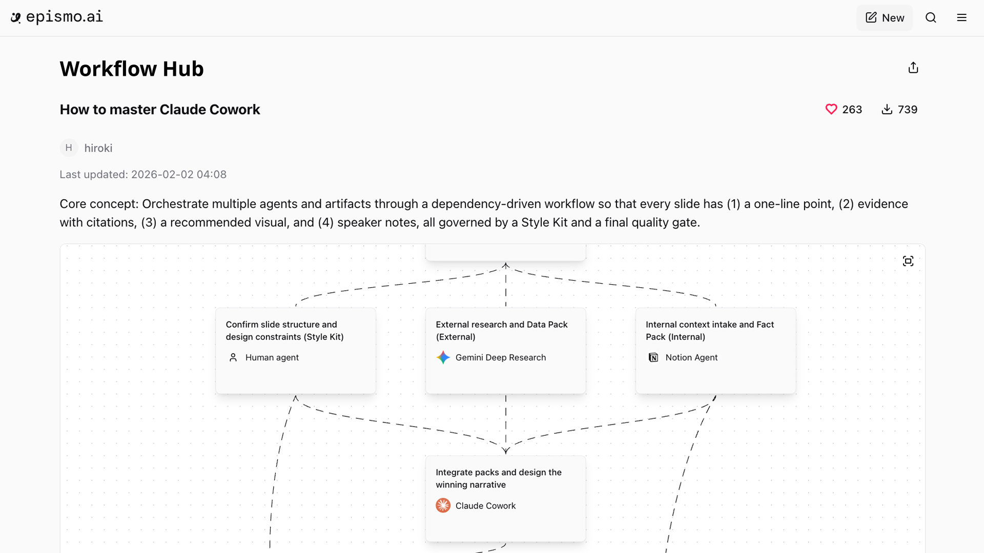 Workflow Hubは、人間とAIのワークフローを再利用可能なプロセスとして共有するオープンライブラリです。単一のプロンプトをコピーする代わりに、タスク分解・ステップ順序・中間成果物・品質チェックといった全体のワークフローをコピーして再現します。