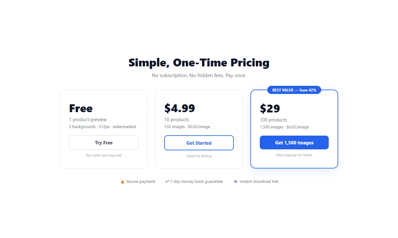 Upload any product photo. AI removes the background and generates 15 professional backgrounds — white for Amazon, dark for premium, marble for luxury, and more — with realistic shadows. In seconds. Batch processing: upload 100 products, get 1,500 marketplace-ready images back in ~15 minutes. Pricing (one-time, no subscription): • Free: 1 photo preview • Starter: $4.99 for 10 products (150 images) • Pro: $29 for 100 products (1,500 images) Built for Amazon, Etsy, Shopify & eBay sellers.